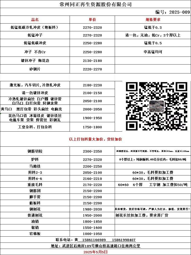 2025年5月5日常州同正再生资源股份有限公司废钢价格