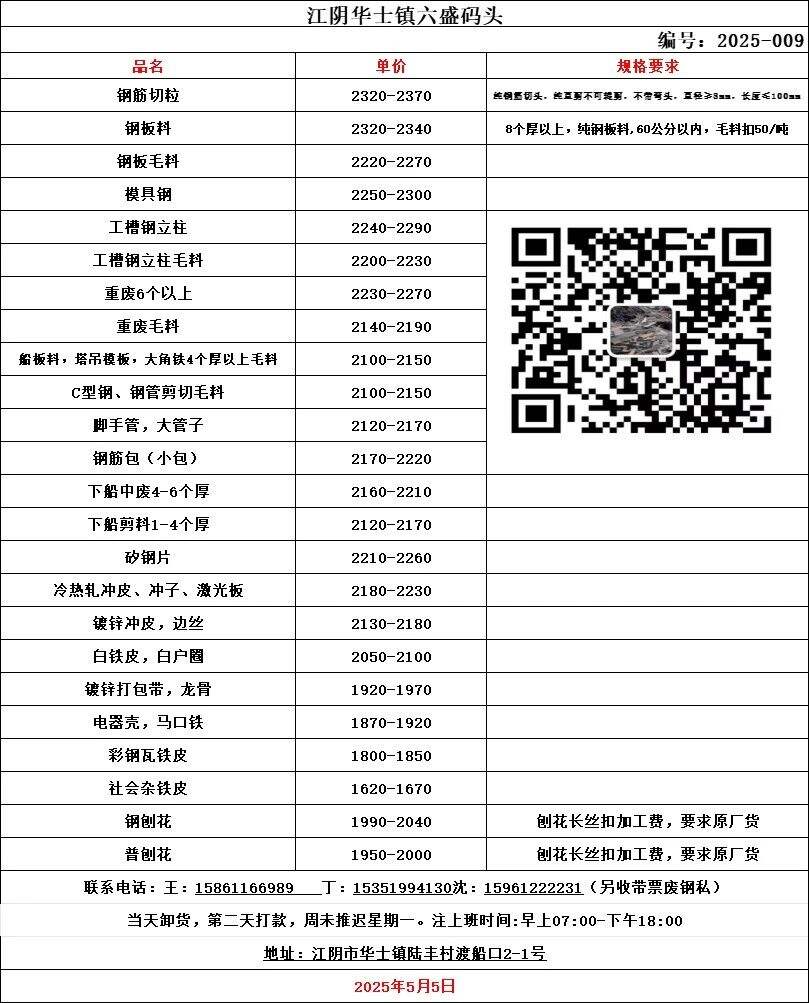 2025年5月5日江苏江阴华士镇六盛码头废钢报价