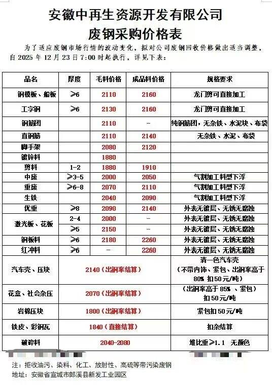 2025年12月23日安徽中再生资源开发有限公司废钢采购价格表