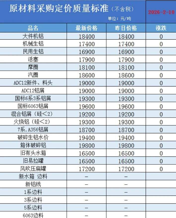 2026年2月10日顺博铝合金湖北有限公司最新价格