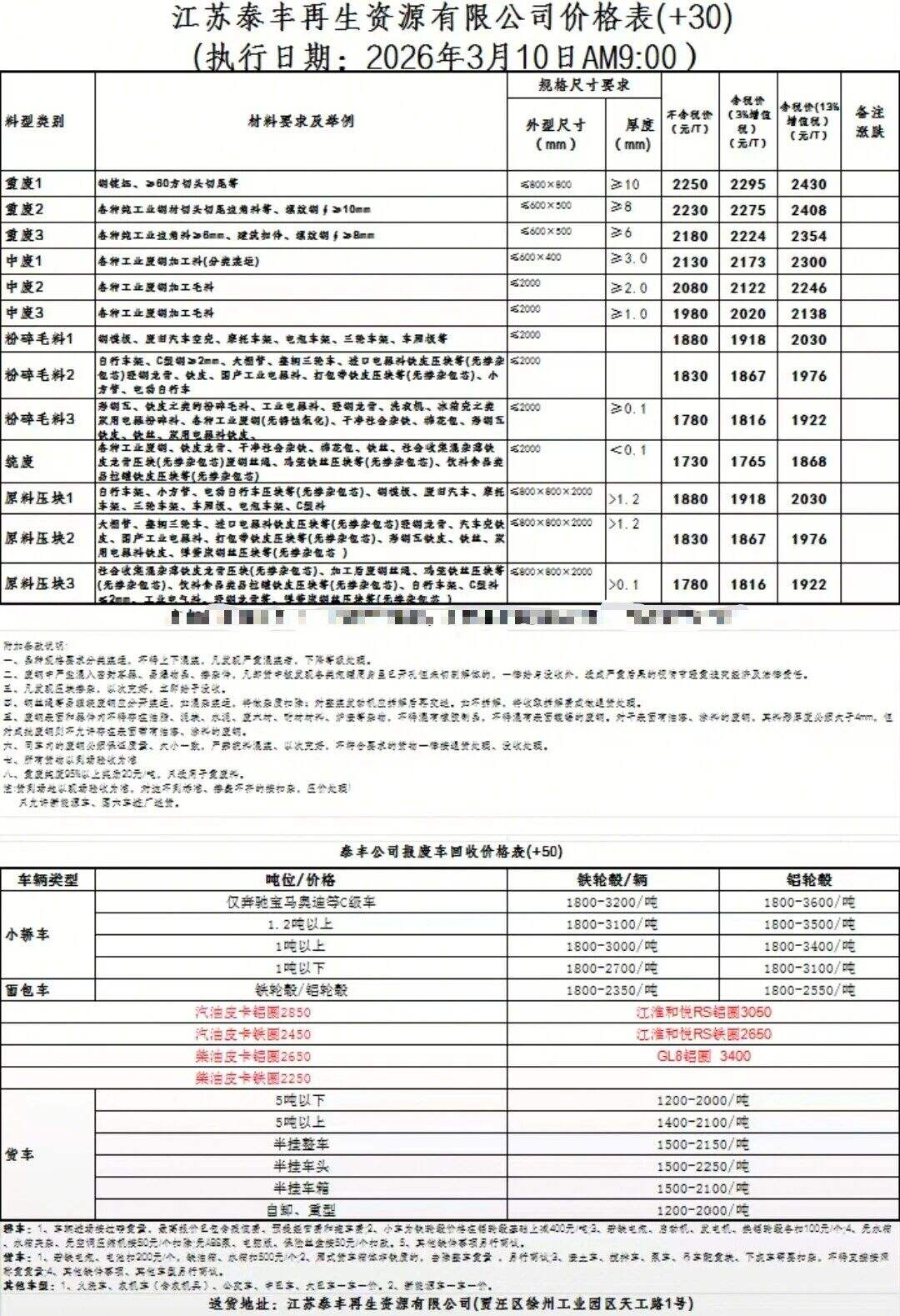 2026年3月10日江苏泰丰再生资源有限公司价格表