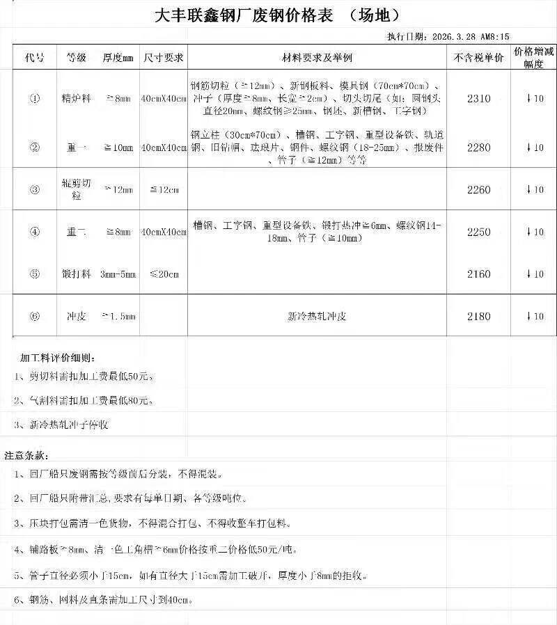 2026年4月3日大丰联鑫钢厂废钢价格表(场地)报价