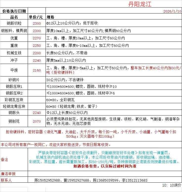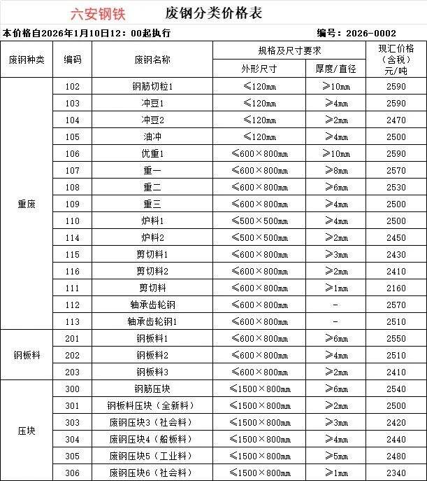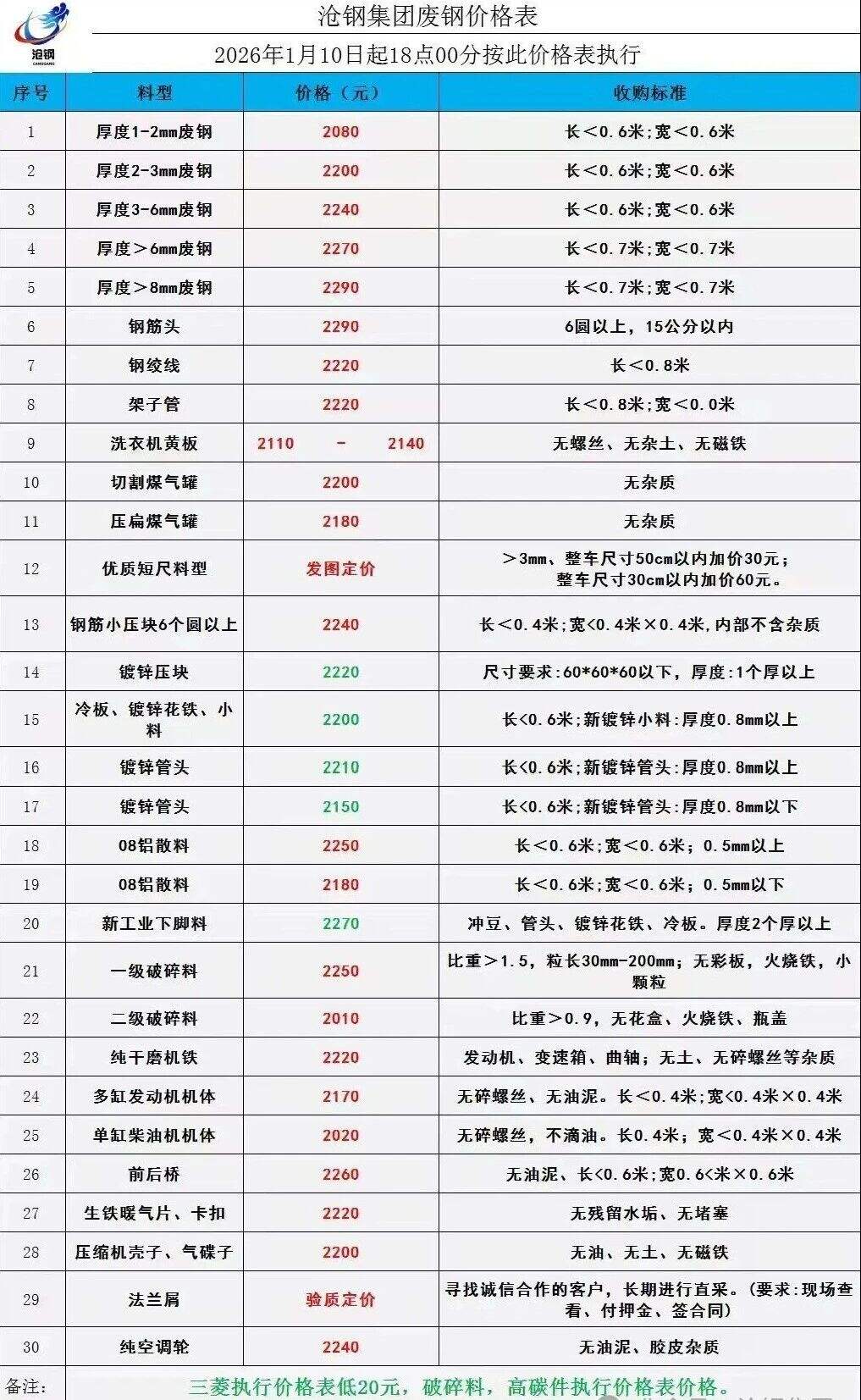 河北天柱钢铁:*月**日**点**开始冲豆执行****元/吨(要求无油无镀锌无杂质)钢筋切粒(手切)一级执行****/吨钢筋切粒(辊剪)二级执行****/吨(要求*圆以上,**mm以内,无穿墙螺丝,无其他杂志)精品:****(火车轮、**以上轨道,钢坯头、圆钢头,模具钢)特级:**mm以上****优质:**mm以上****(大转子,大定子,)重A:*-**mm****(*~*厚冲豆)重B:*-*mm****重C:*-*mm****(小转子,小定子,)尺寸要求:*.*×*.*热轧散片:****矽钢片:****。