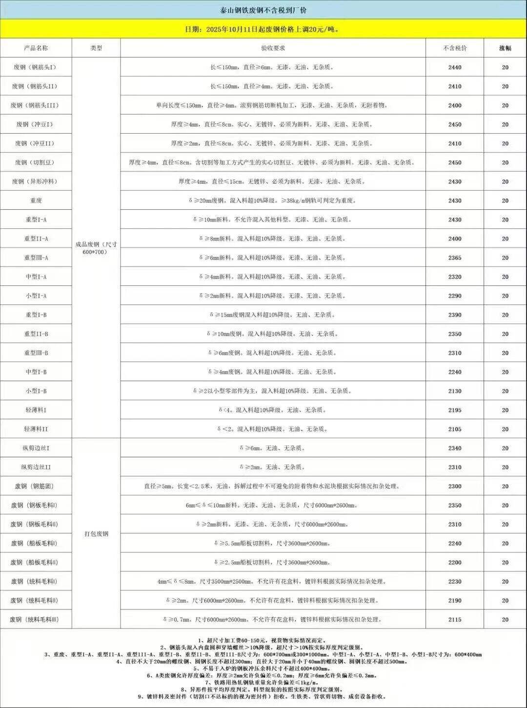 山东泰山钢铁泰钢通知:**月**日起,废钢不含税到厂价格上调**元/吨。