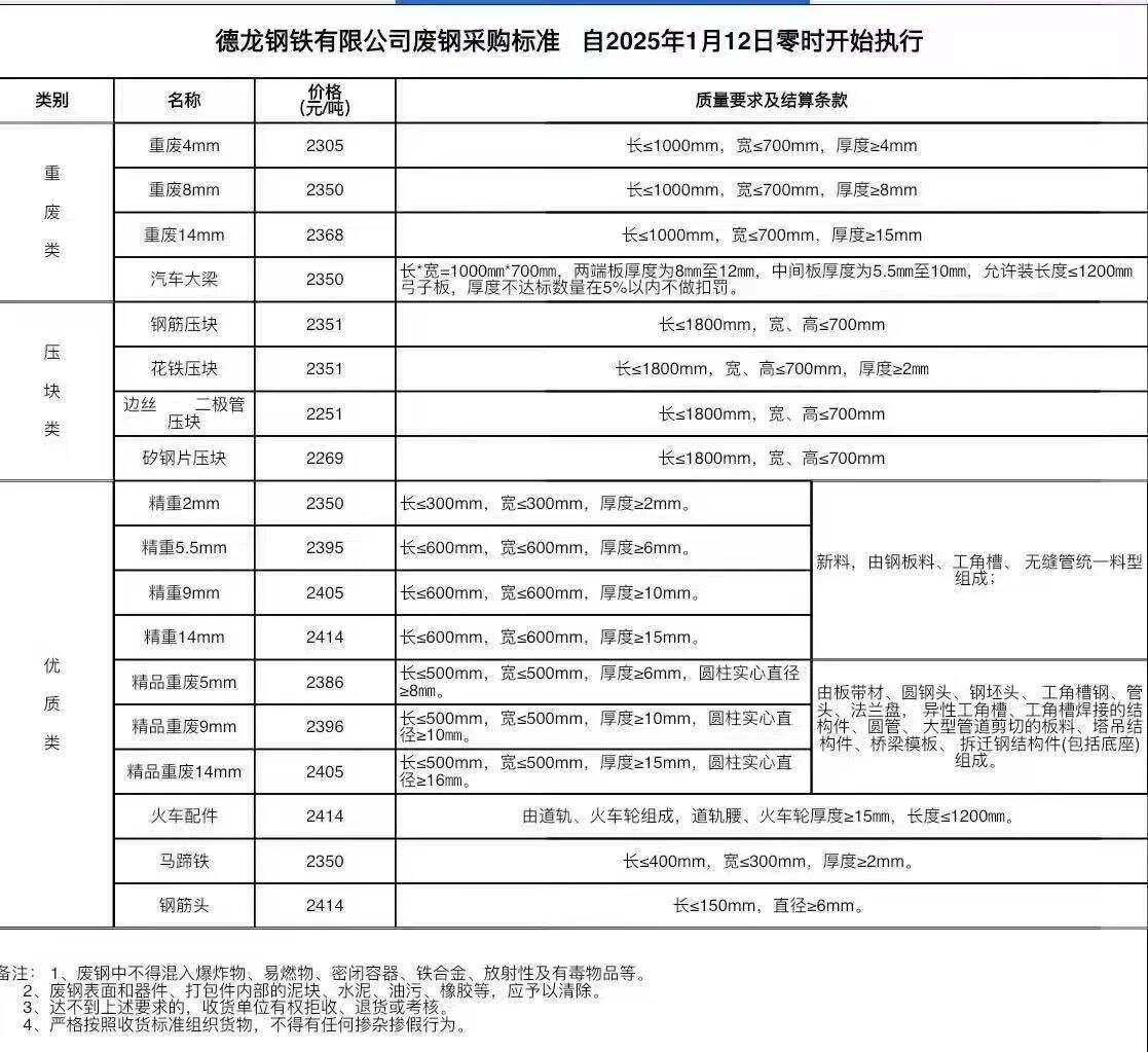 邢台德龙通知,废钢价格上调邢台德龙****年*月**日零时最新,重废*厚****,重废*厚****,重废**厚****,汽车大梁****,钢筋压块****,花铁压块****,边丝极管压块****,矽钢片压块****,精重*厚****,精重*.*厚****,精重*厚****,精重**厚****,精品重废*厚****,精品重废*厚****,精品重废**厚****,火车配件****,马蹄铁****,钢筋头****,不含税