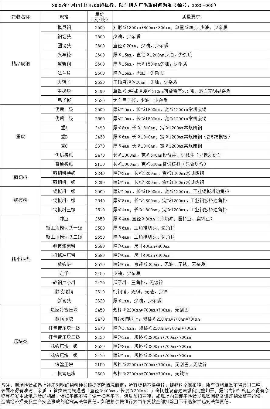 ****年*月**日**时起,吕梁建龙所有料型不含税上调**元/吨**日吕梁建龙废钢最新涨**,剪切料****,冲压料****,钢筋头****,废旧道轨****,废旧火车轮****,优质废钢****,重废特级****,重废一级****,重废二级****,重废三级****,中废****,钢板边角料一级****,钢板边角料二级****,一级****,二级****,钢筋压块停收,汽车前后桥****,不含税