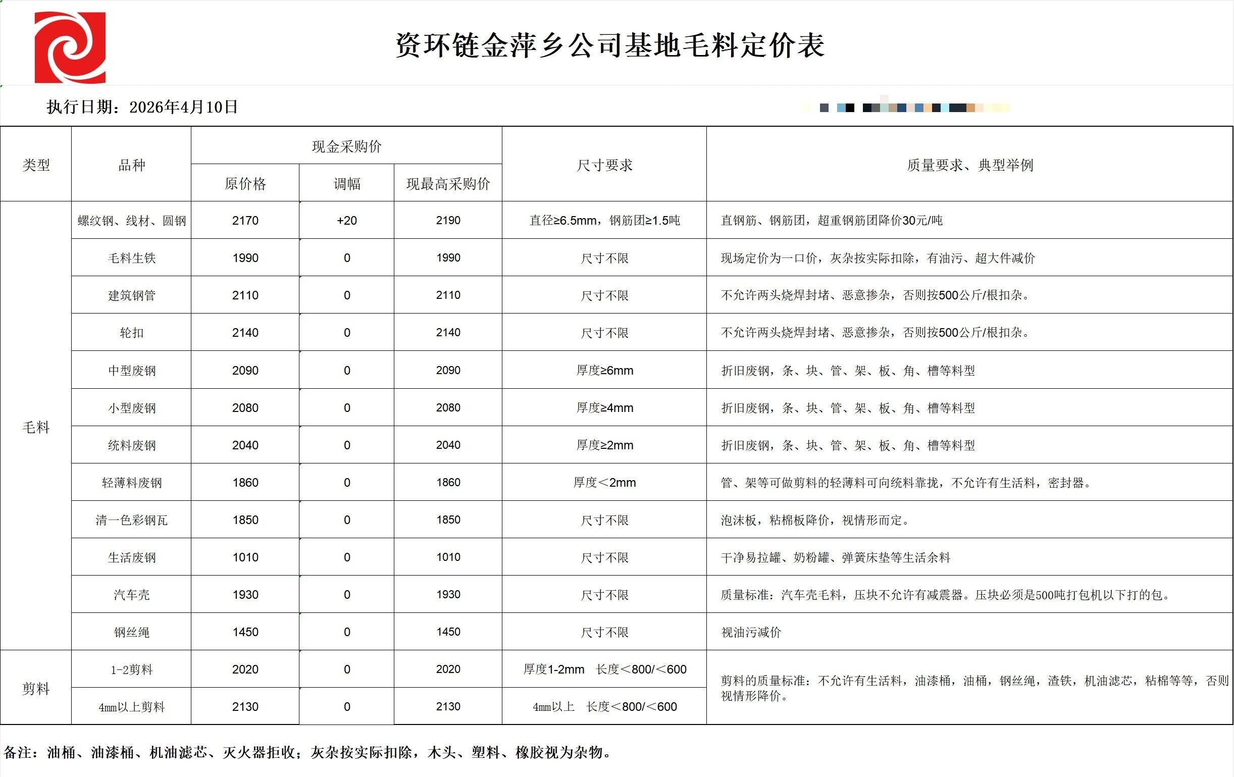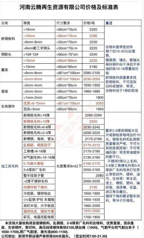 ****年*月**日河南云腾再生资源有限公司价格及标准表