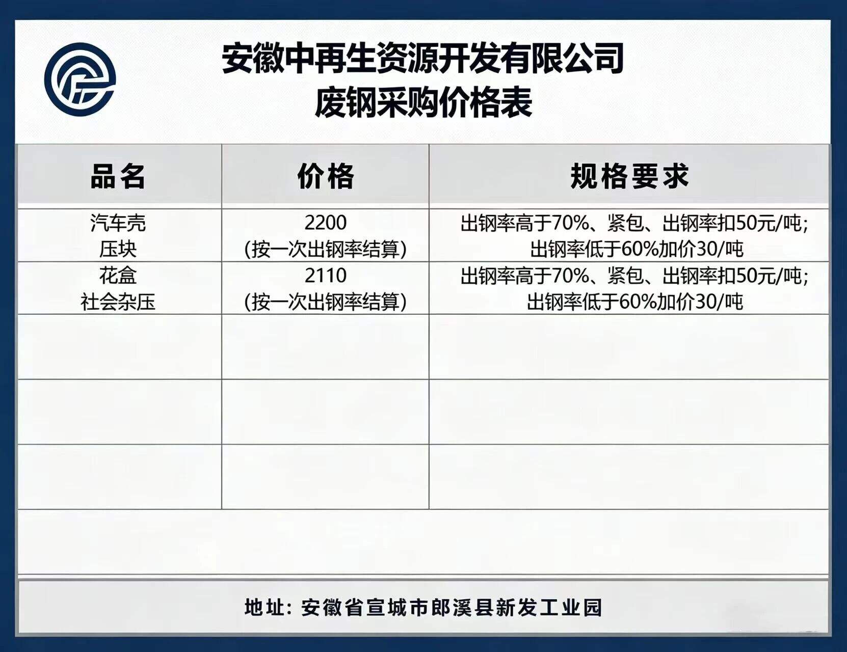 ****年*月**日安徽中再生资源开发有限公司废钢采购价格表