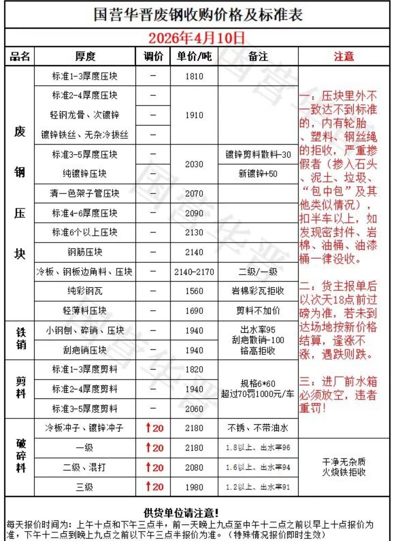 ****年*月**日山西国营华晋废钢收购价格及标准表