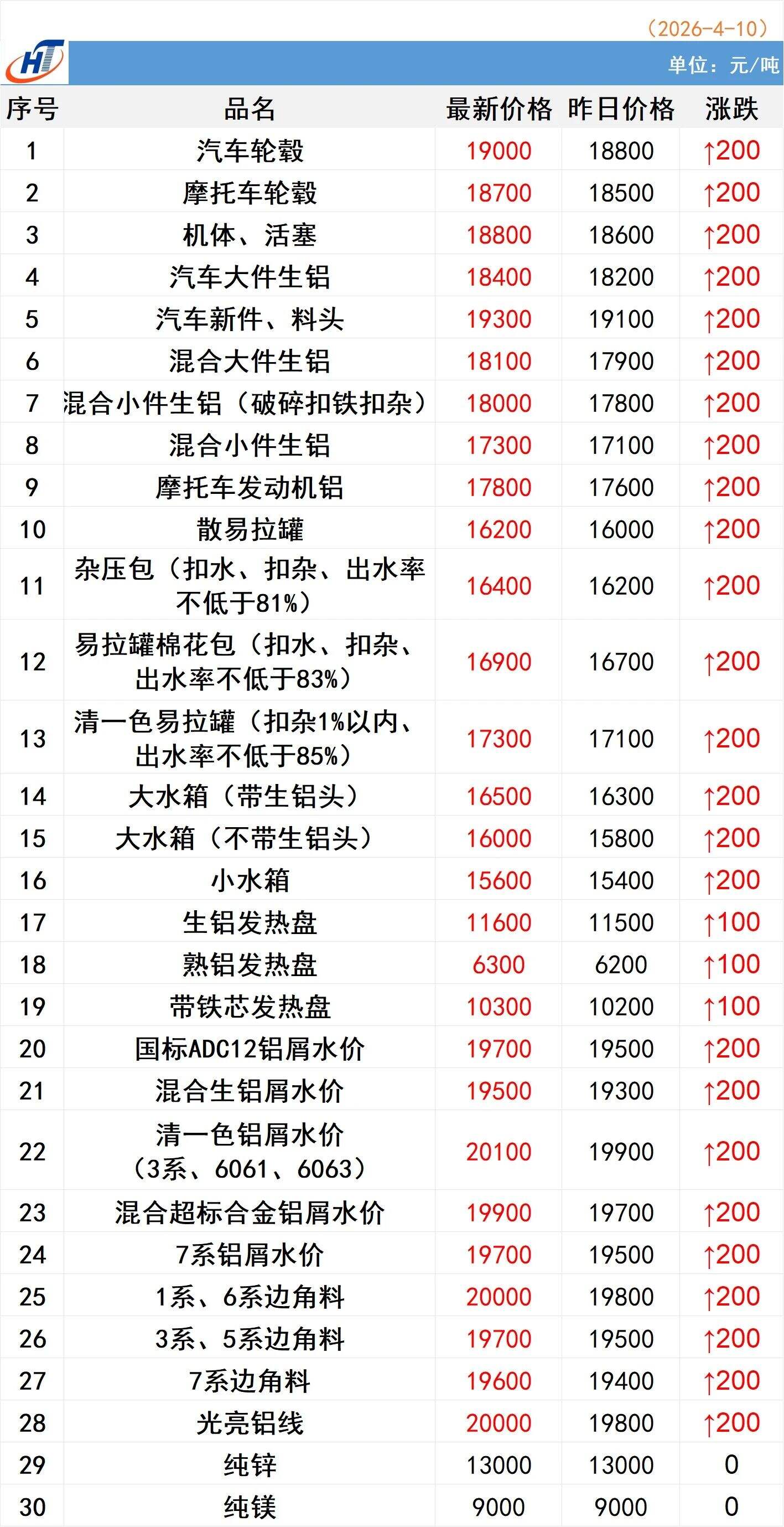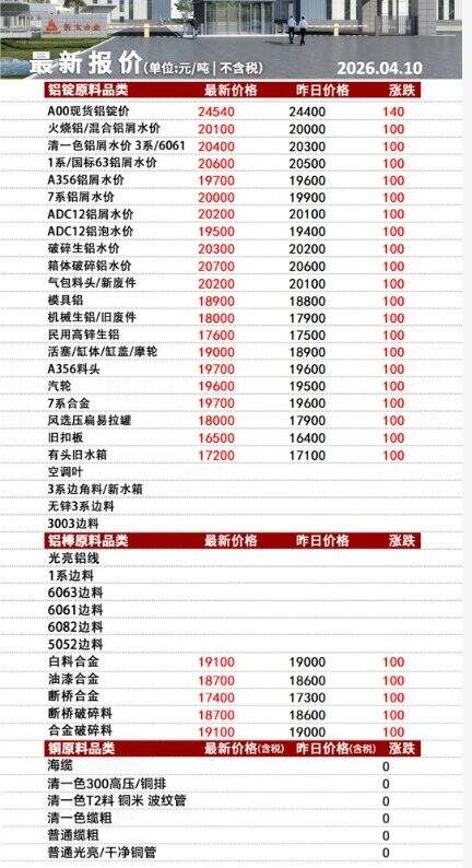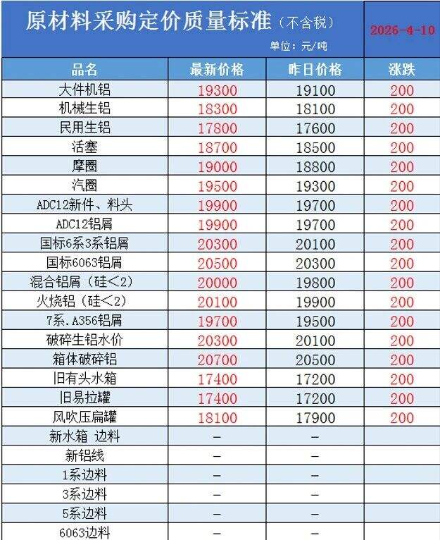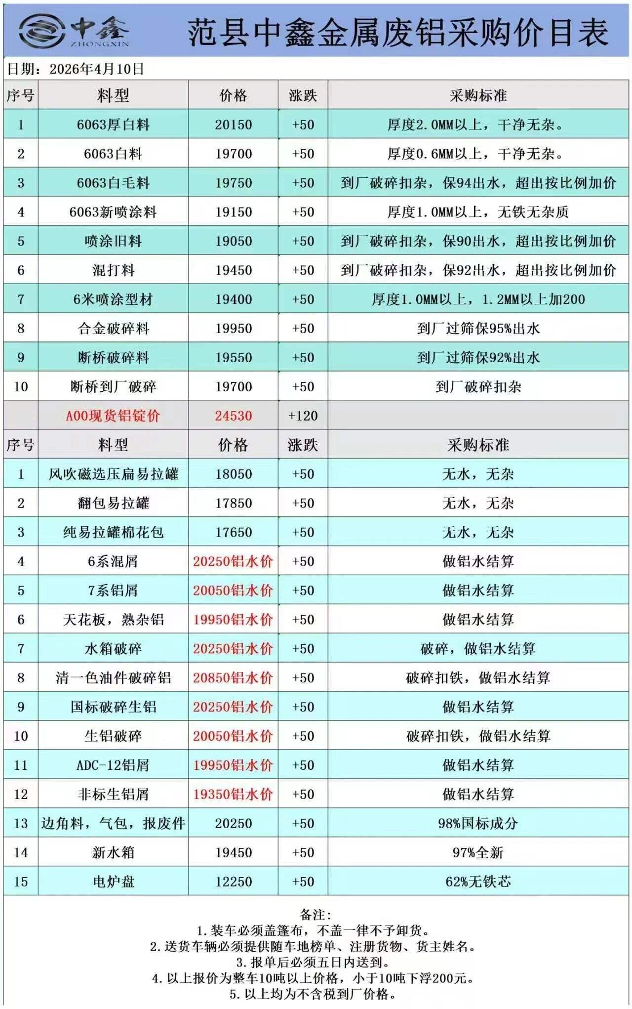 ****年*月**日河南范县中鑫金属废铝采购价目表
