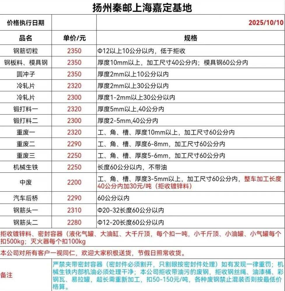 扬州鸿蓝钢铁:收购冷板打包料,热板打包料,激光板厚度*个以下,价格****, 钢板料*个厚以上****-**** 纯冲子,冲豆**** 重废****-****, 镀锌铁皮:****-**** 剪料*-*厚****-**** 大量高价收购各种杂废钢,按货定价。 收购电话***********徐,微信同步, 地址:邗江区槐泗镇肖胡村肖胡路*号