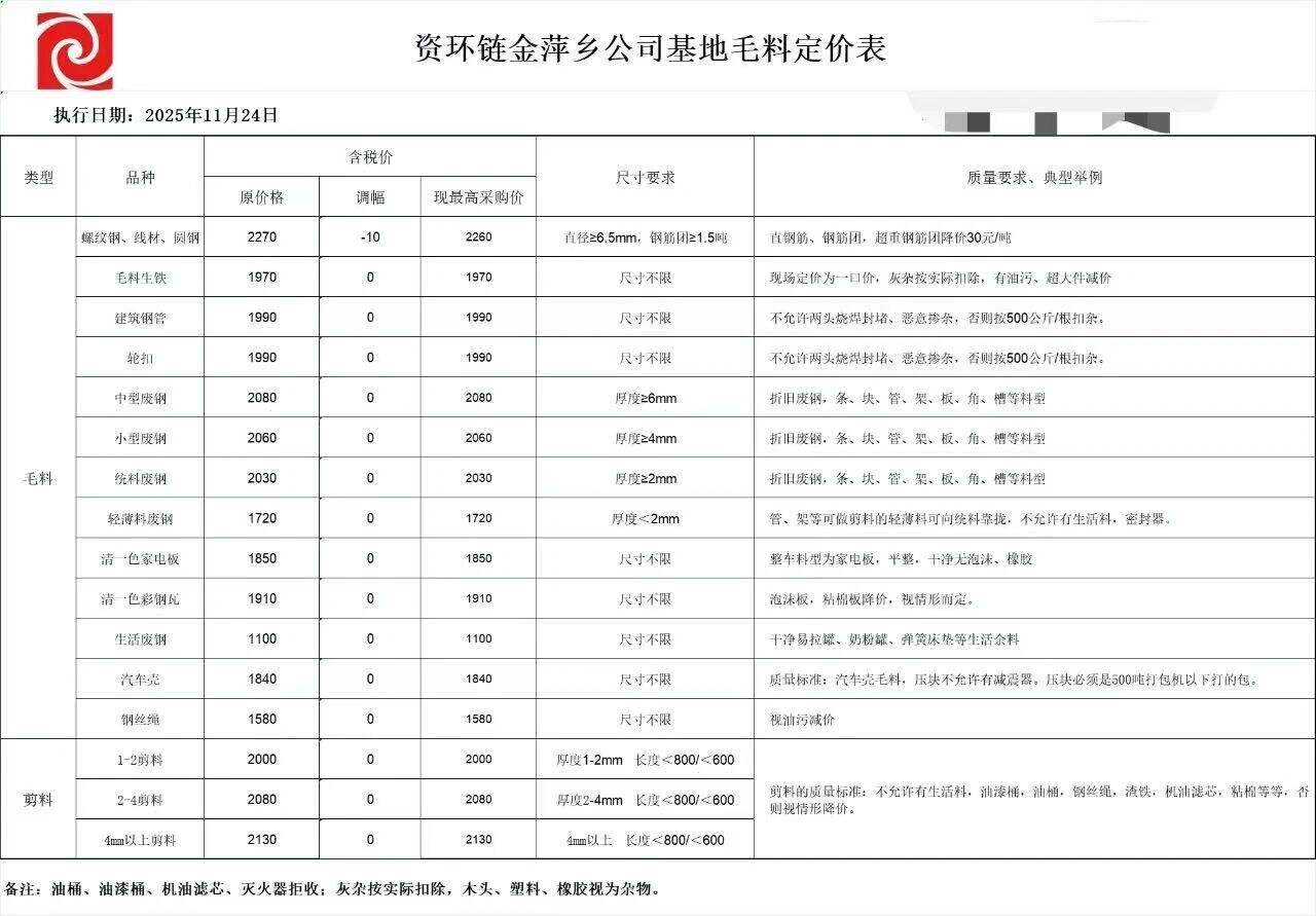**日资环链金萍乡公司中心加工基地收货价格:货场钢筋毛料价格下调**元/吨。