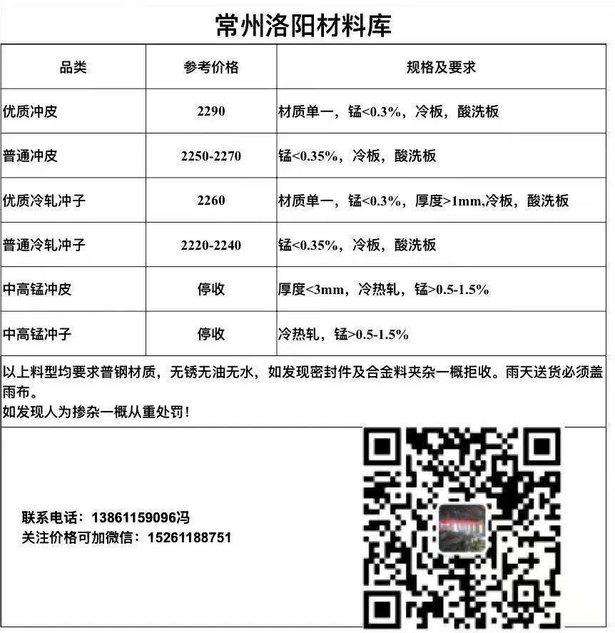 洛阳材料库高价收购、自提冷板冲皮,钢板料。收购价:优质冷板酸洗冲条冲皮最高****,普通低锰冷板酸洗冲条冲皮****-****,低碳低锰冲子****-****,中高锰冷热混打包料停收,中高锰冷热冲子停收,联系电话***********冯,关注最新价格请加微信:***********。地址:江苏常州武进洛阳镇创盛路*号