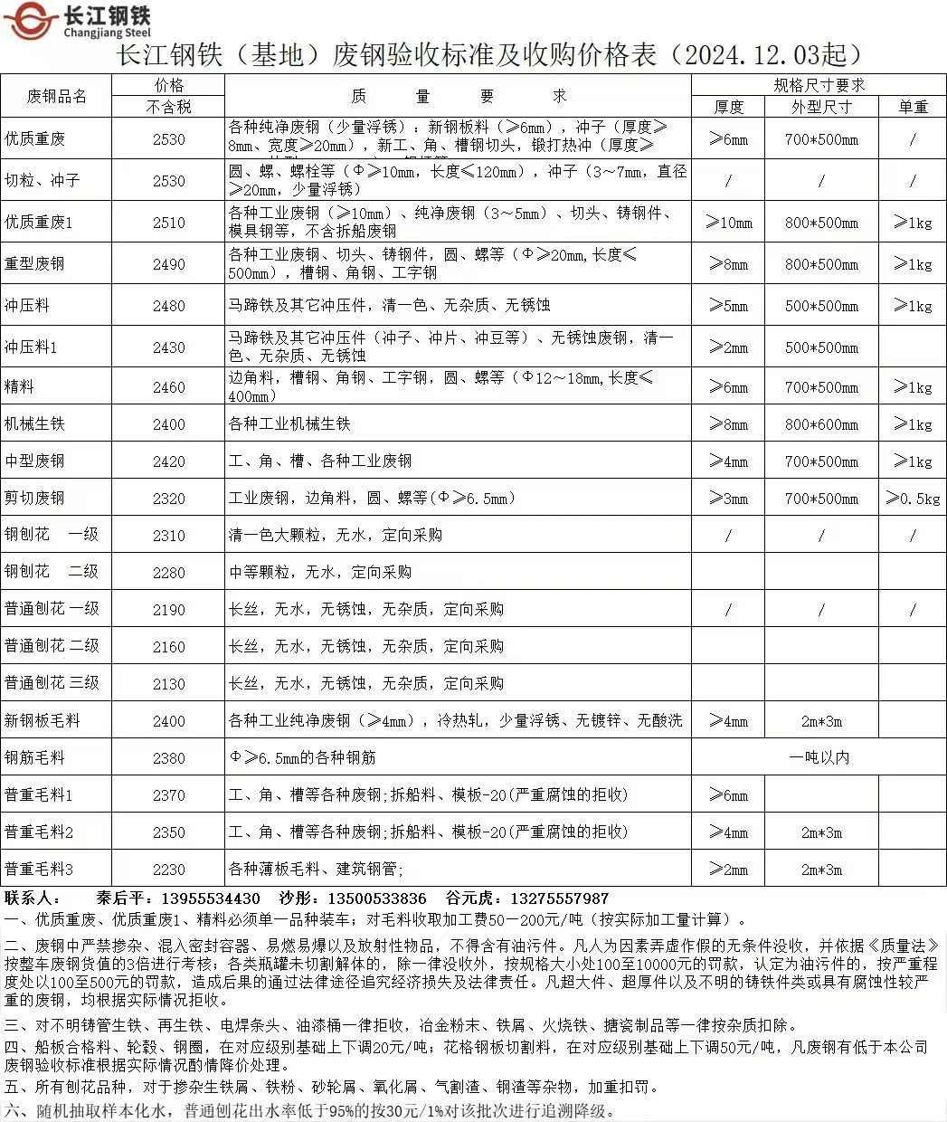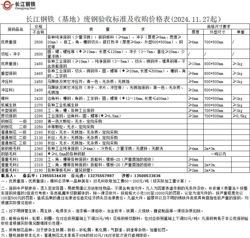 **月*日贵航一期:涨**钢筋切粒、****(**以上十公分以内)*个厚以上的重废****、(尺寸**x**)*-*个厚的中废****、(尺寸*****)剪料****-****、(尺寸**小***)铁销****、其他货具体看货定价。(超过尺寸扣加工费**-***元、大件加扣***公斤发动机油没有放干净加扣***公斤,废钢严禁携带压块如有发现重罚,混合料降级处理!