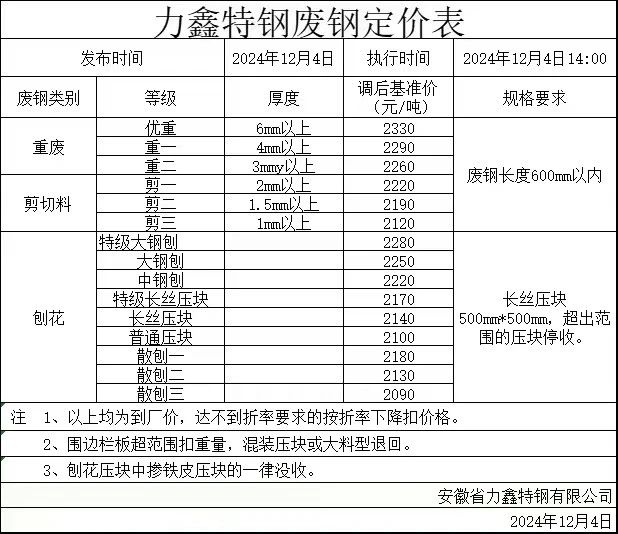 **日安徽力鑫特钢涨,重废****-****剪切料****-****散刨花****-****不含税