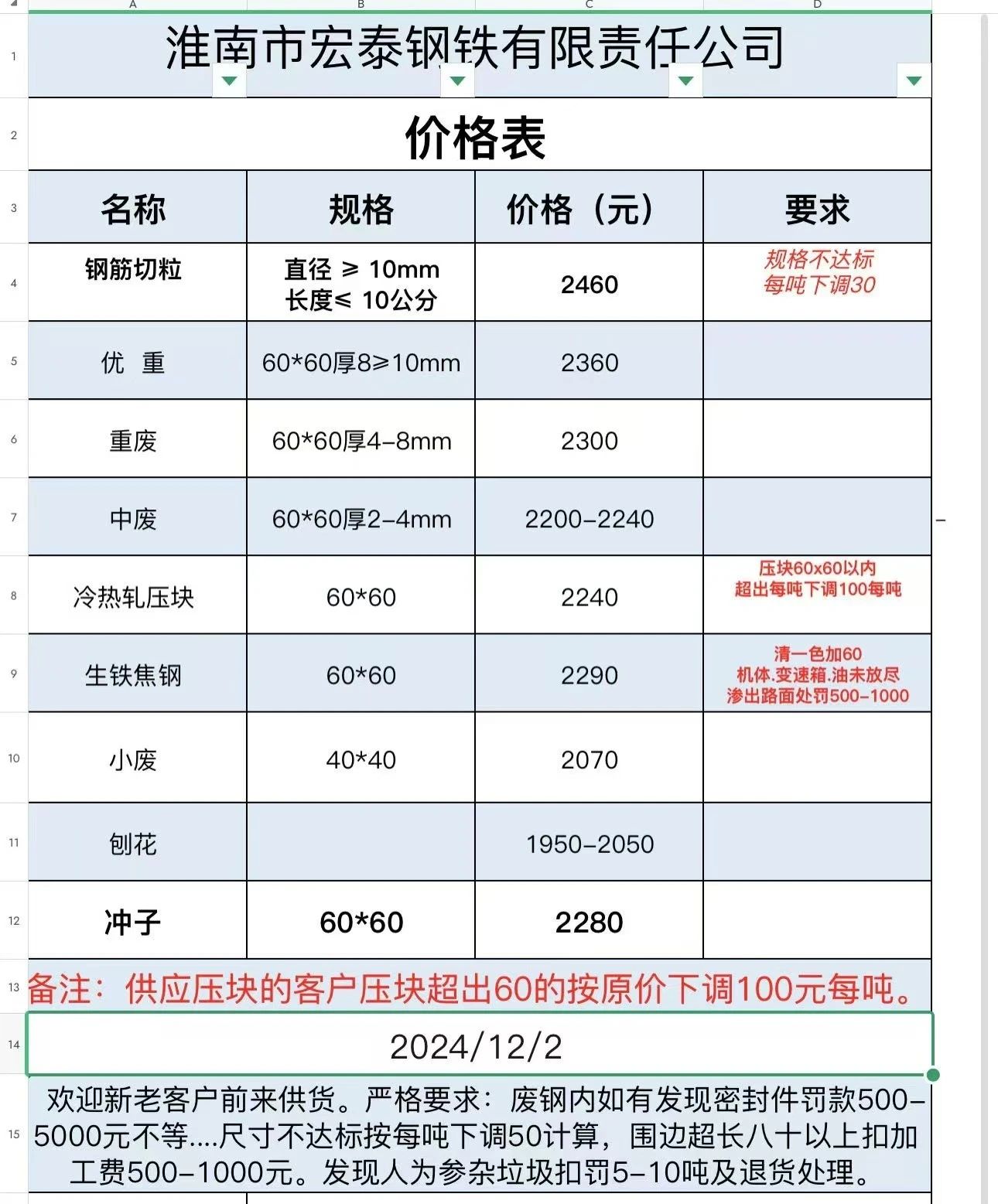*日郎溪鸿泰,重废一****重废二****机生铁****中废一****中废二****剪料****未达标准的一律退货,生铁**公分以内,重废**公分以内,密封件重罚,掺假罚款*-**万,价格以到厂验货为准