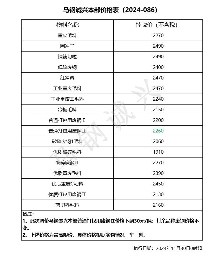 **月**日起,马钢诚兴本部部分品种废钢价格下调**元/吨,调整后: