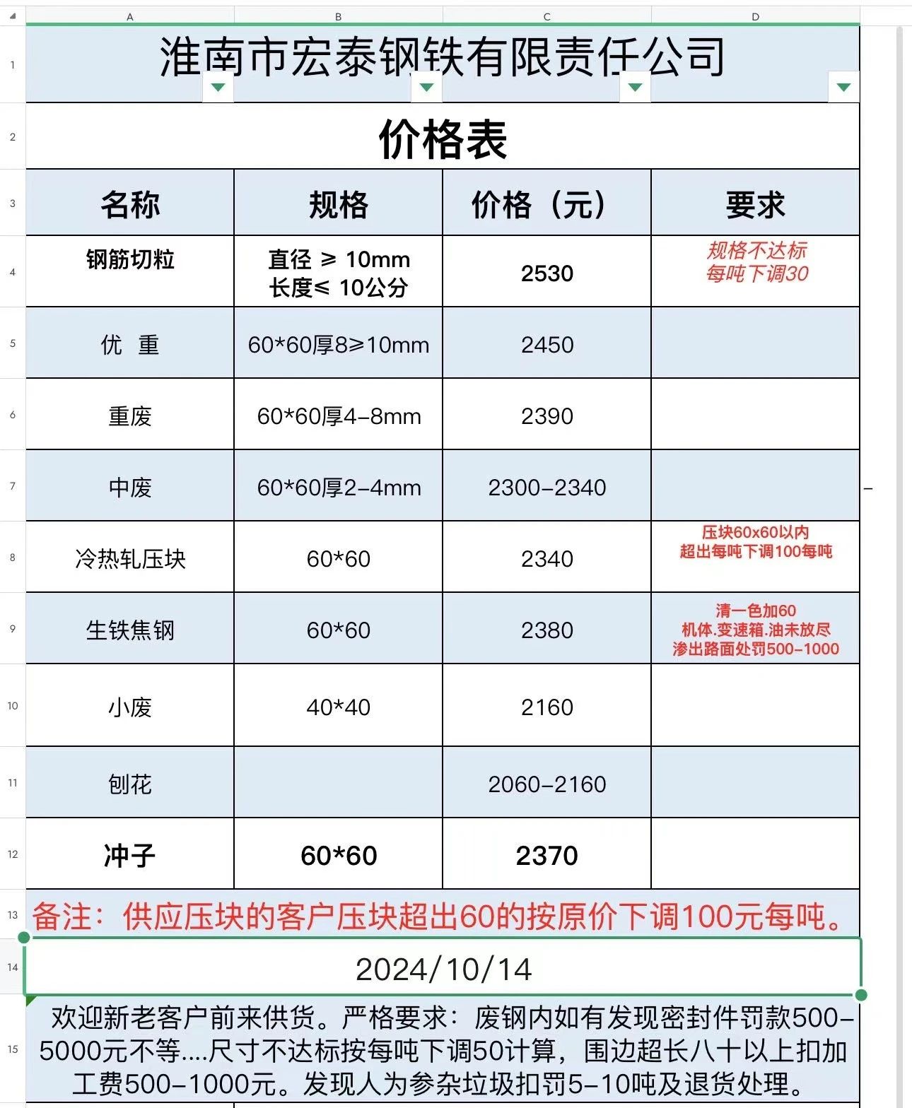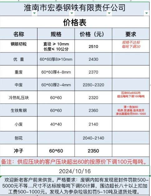 **日淮南宏泰废钢跌**,钢筋切粒****,优重****,重废****,中废****-****,冷热轧压块****,生铁焦钢****,小废****,刨花****-****,冲子****不含税