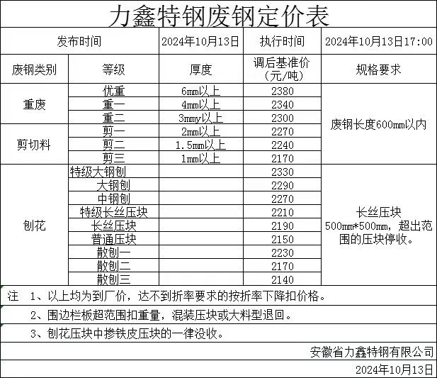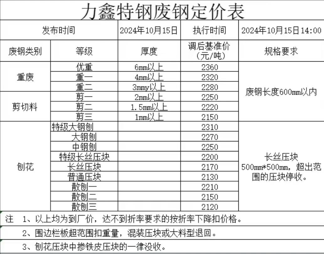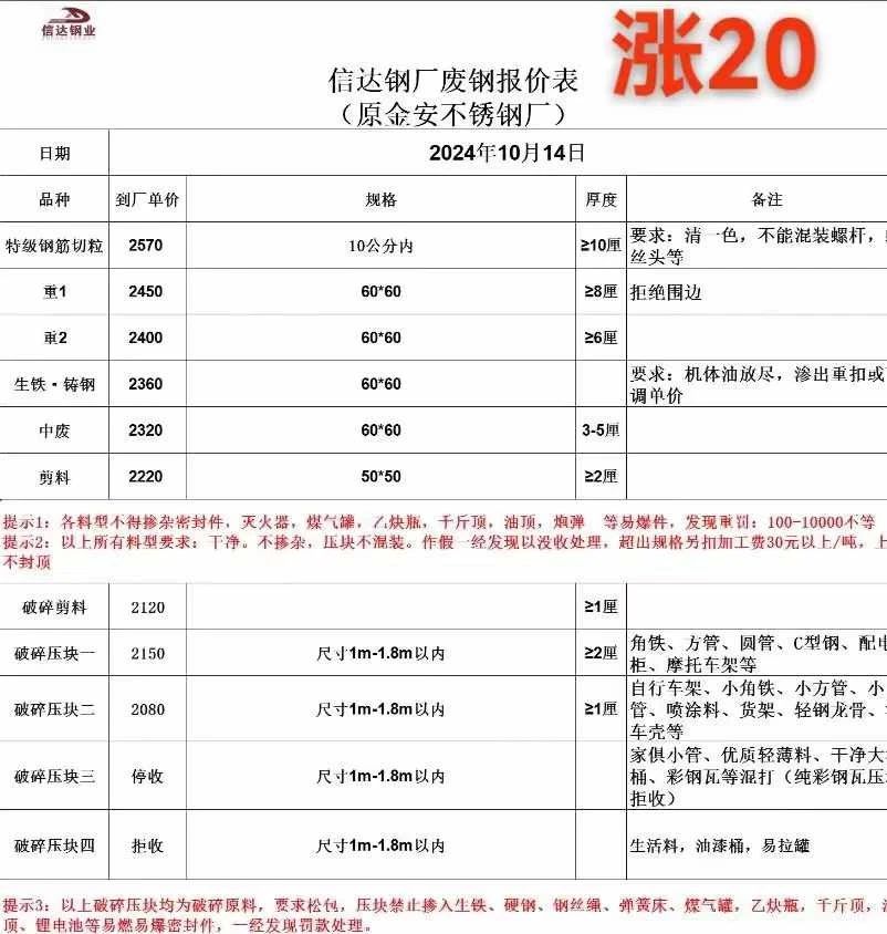贵航一期:涨**钢筋切粒、****(**以上十公分以内)*个厚以上的重废****、(尺寸*****)*-*个厚的中废****、(尺寸*****)剪料****-****、(尺寸**小***)铁销****、其他货具体看货定价。(超过尺寸扣加工费**-***元、大件加扣***公斤发动机油没有放干净加扣***公斤,废钢严禁携带压块如有发现重罚,混合料降级处理!
