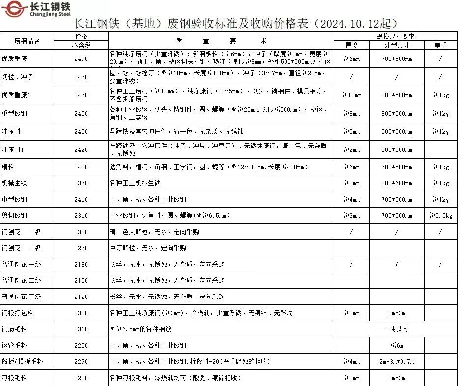 安徽长江钢铁马钢利华基地根据目前市场行情以及生产情况,现对废钢收购价格自**月**日起统一下调**元/吨,即优质重废****元/吨;重型废钢****元/吨;中型废钢****元/吨;剪切废钢****元/吨;(均为不含税挂牌价),具体价格见下表;