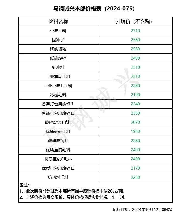 **月**日起,马钢诚兴本部所有品种废钢价格下调**元/吨,调整后: