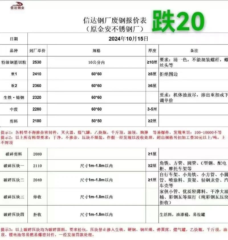 **日六安信达钢厂跌**:钢筋切粒****重一****重二****生铁铸钢****中废****剪料****破碎剪料****。破碎压块一****。破碎压块二****。破碎压块三停收不含税,装车前一天报计划,超出计划按本地铁收-购扣**一吨。。.