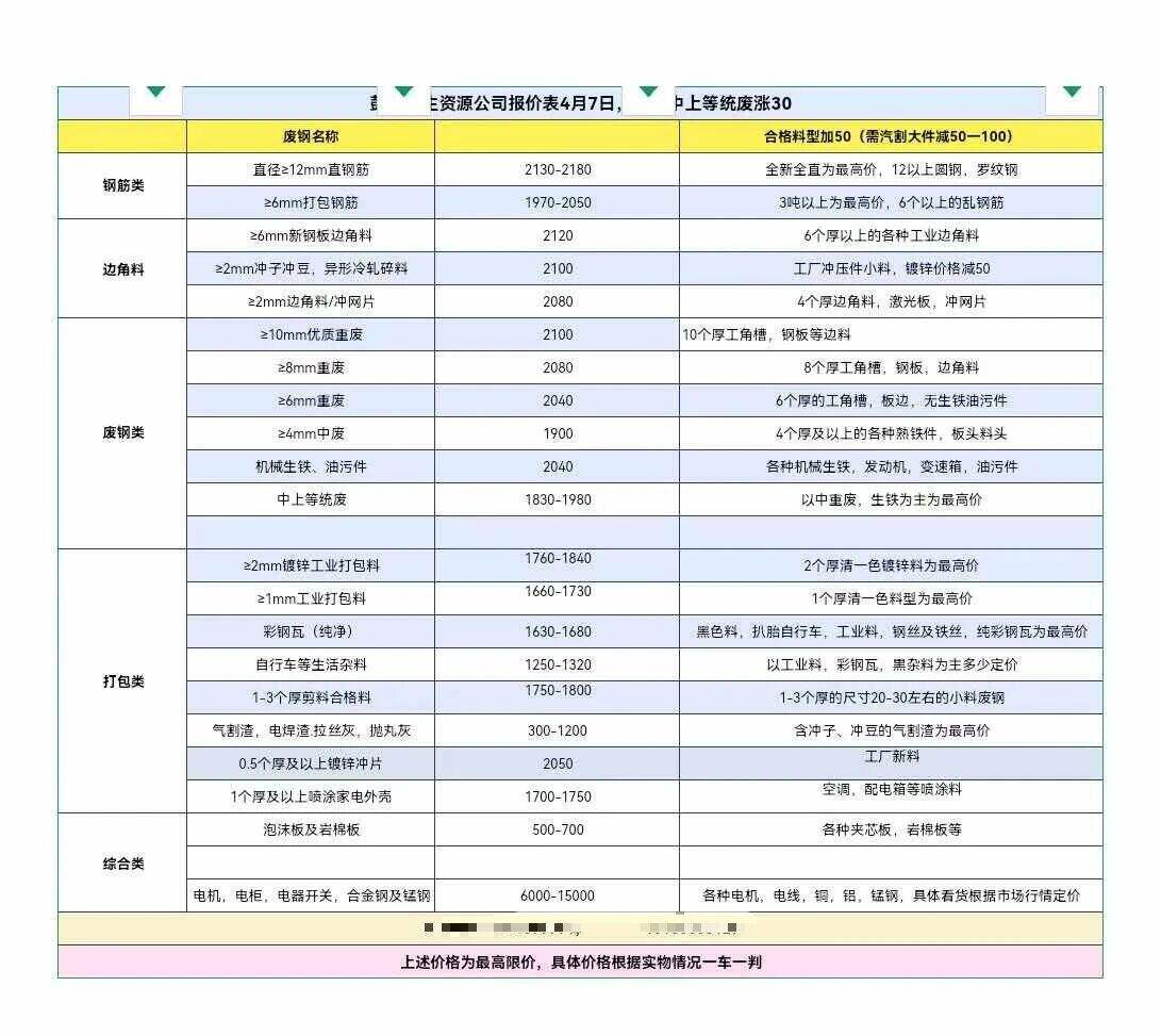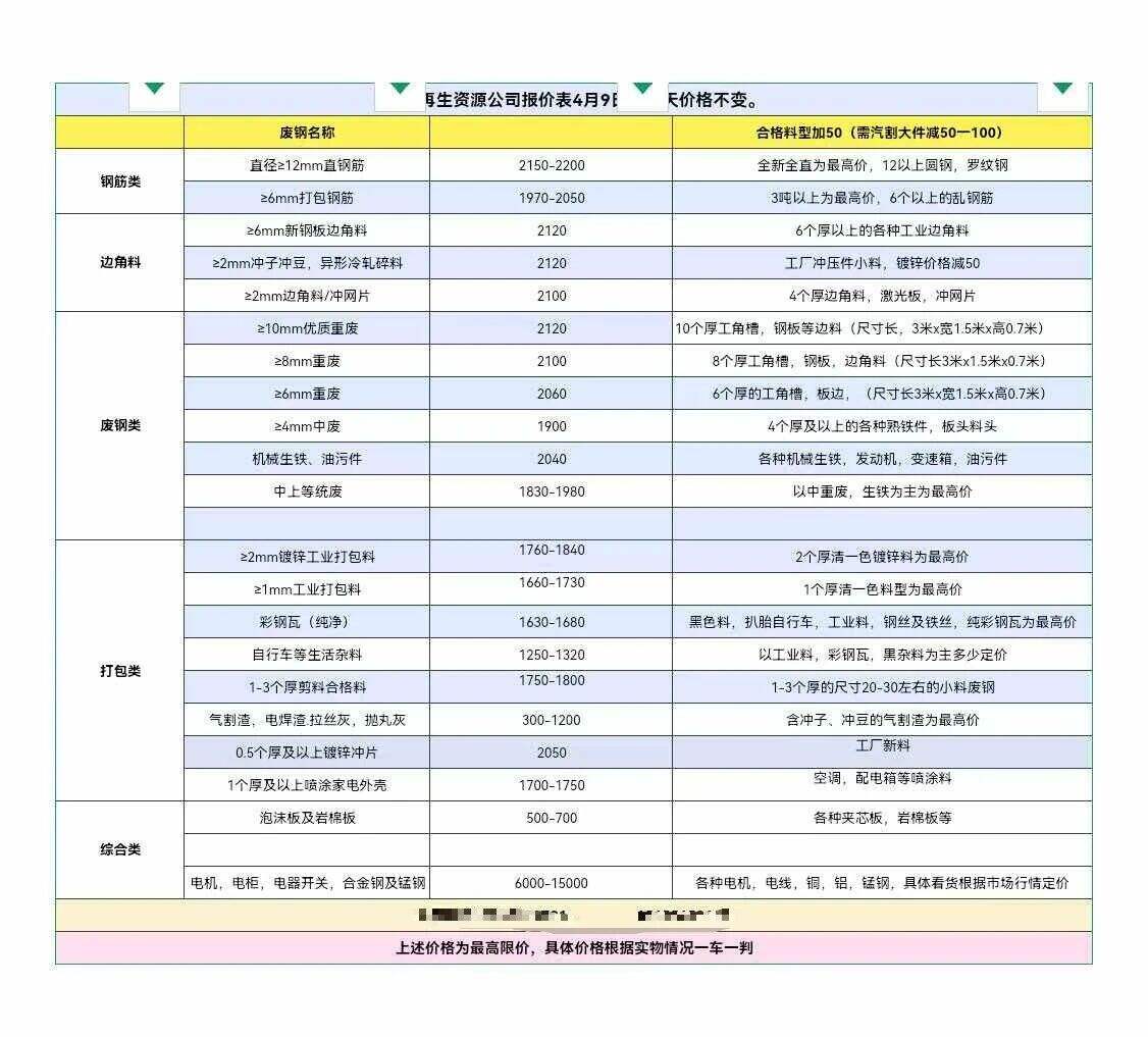 暂定:钢板料(*个厚)****,冲压料、马蹄铁****,优质重废(*个厚以上)****,重废(*个厚)****,中废(*个厚)、卡扣****,报量锁价合同截止**点(欢迎带票业务,具体带票价格电话咨询)