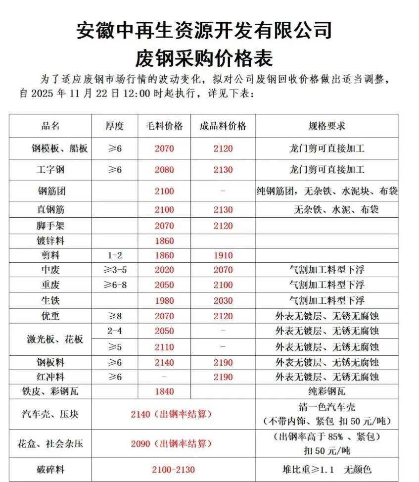 ****年**月**日安徽中再生资源开发有限公司废钢采购价格表