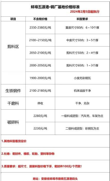 二:≥*mm工业优重(工槽钢、大角铁、钢立柱,钢模板等清一色料型)****~****,≥*mm重废****~****,生铁油污件****,≥*mm中废,含镀锌料****~****,以上品种合格料型➕**(大件类汽割料型价格表减**~***元);