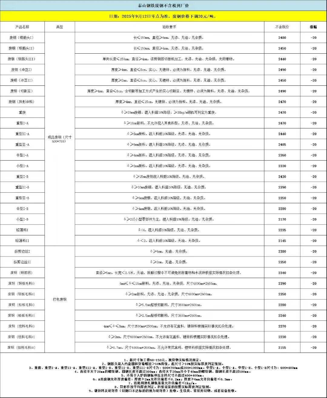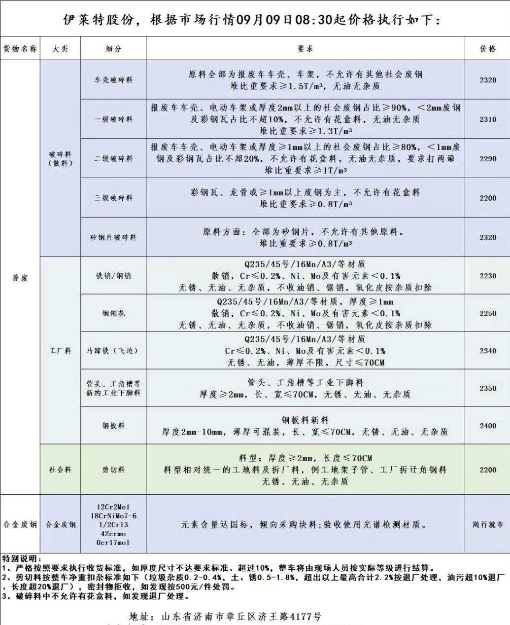 潍坊特钢*%增值税专用发票----重型废钢:****元/吨,特级废钢:****元/吨,中级废钢:****元/吨**%增值税专用发票---重型废钢:****元/吨,特级废钢:****元/吨,中级废钢:****元/吨废钢个人户----------重型废钢:****元/吨,特级废钢:****元/吨,中级废钢:****元/吨以上规格及价格自****年*月*日中午**点开始执行。