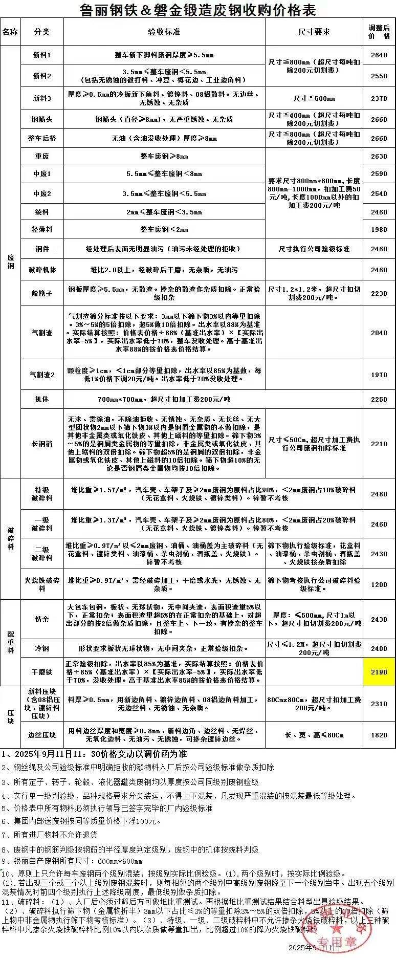 鲁丽各位领导:****年*月**日**:**一、合金返回料暂不做调整。二、公司其余种类除干磨铁外暂不调整外,其余种类价格上调**。三、基地废钢价格上调**四、协议类除纸业废纸钉外,其余种类上调**。