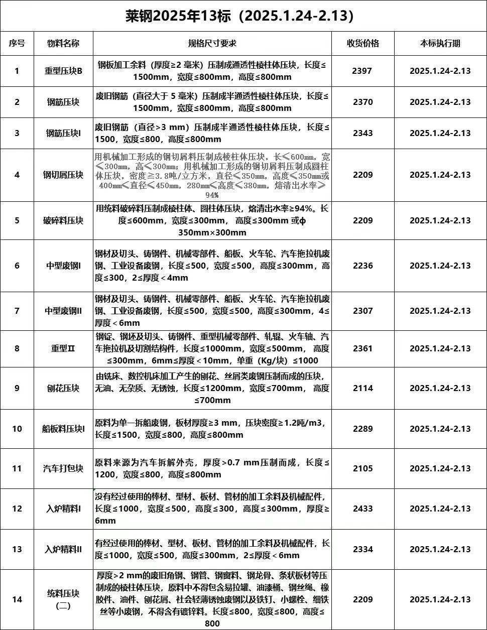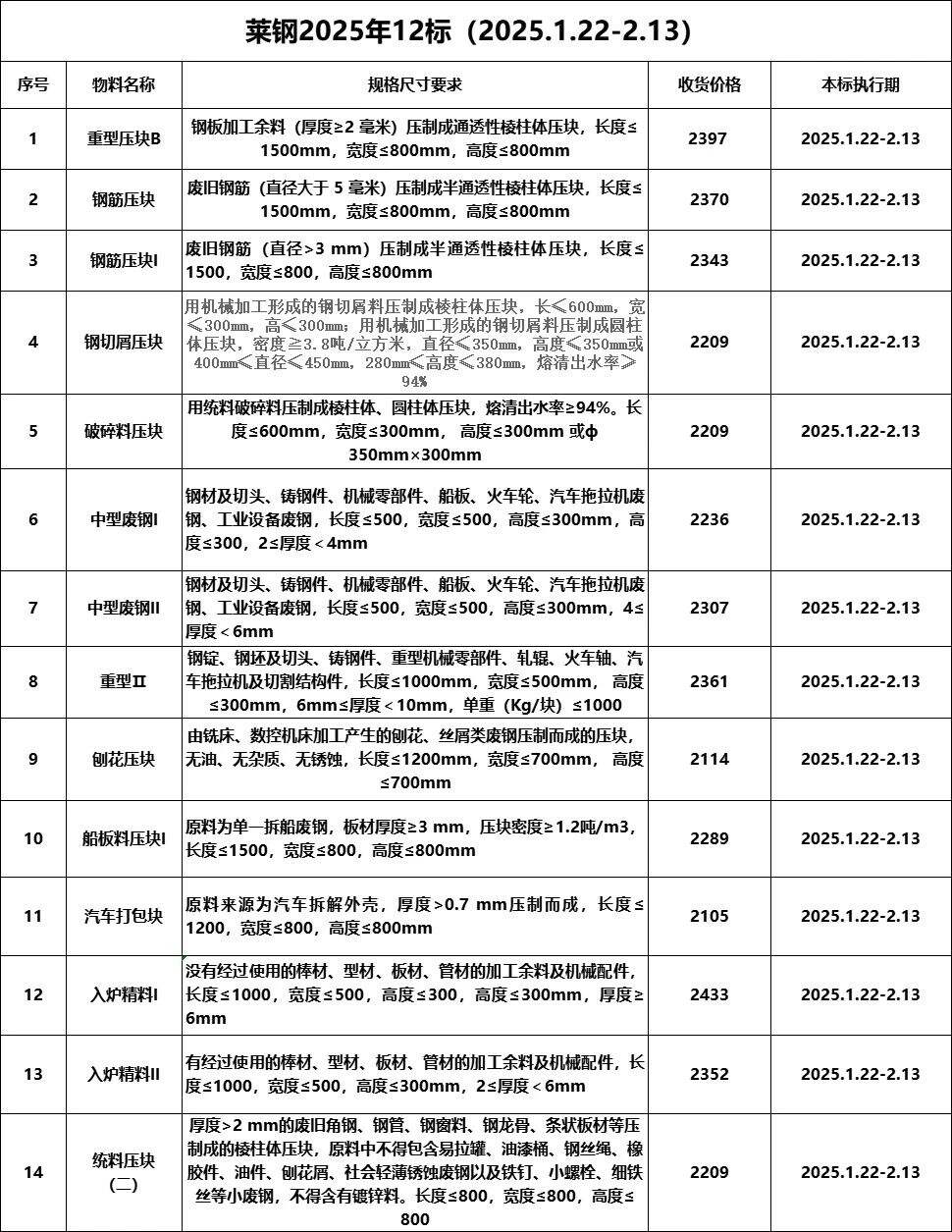 莱钢最新招标价,重型压块B****,钢筋压块****,钢筋压块I****,钢切屑压块****,破碎料压块****,中型废钢I****,中型废钢II****,重型Ⅰ****,重型Ⅱ****,船板料压块Ⅰ****,汽车打包块****,入炉精料Ⅰ****,入炉精料Ⅱ****,统料压块二****含税