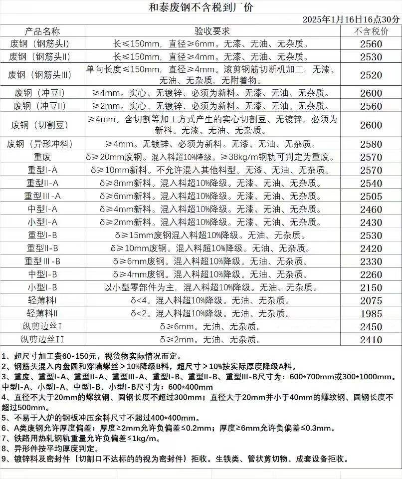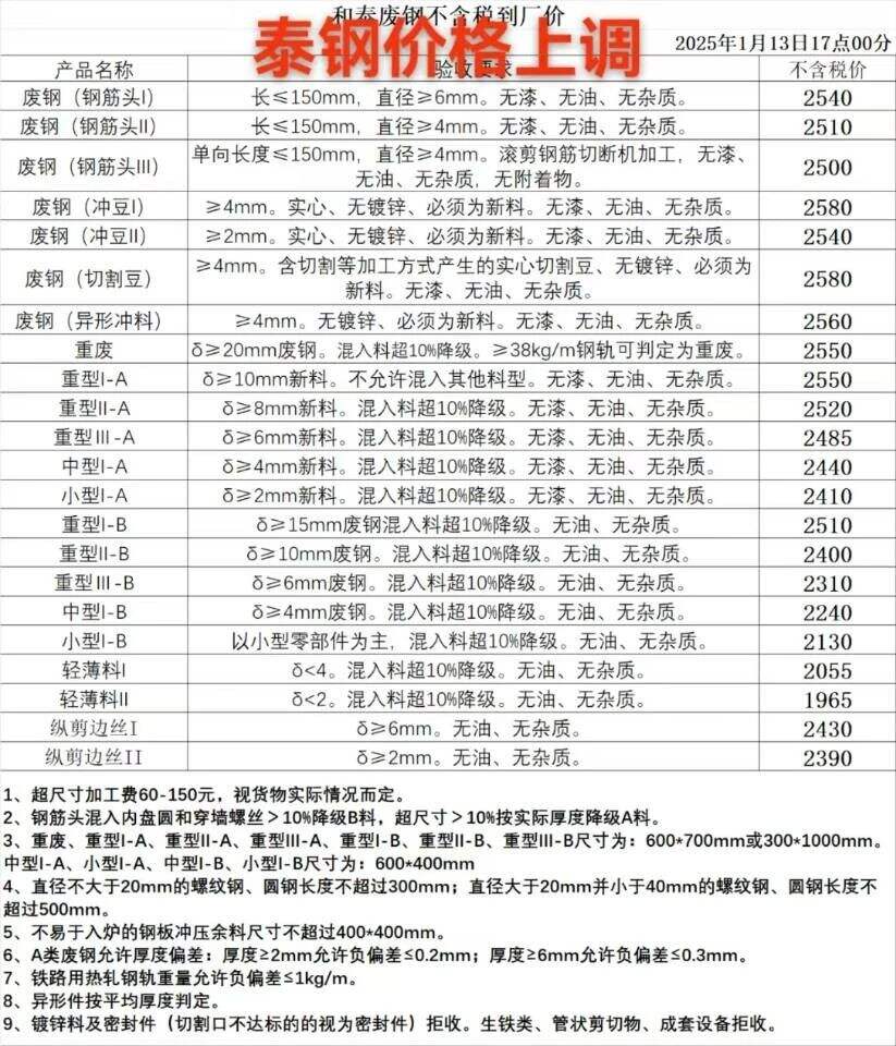 泰山钢铁自*月**日起,不含税指导价,废钢(钢筋头I)****,废钢(钢筋头II)****,废钢(钢筋头III)****,废钢(冲豆)****,废钢(冲豆II)****,废钢(切割豆)****,废钢(异形冲料)****,重废****,重型I-A****,重型II-A****,重型Ⅲ-A****,中型I-A****,小型I-A****,重型I-B****,重型II-B****,重型Ⅲ-B****,中型I-B****,小型I-B****,轻薄料I****,轻薄料II****,纵剪边丝I****,纵剪边丝II****