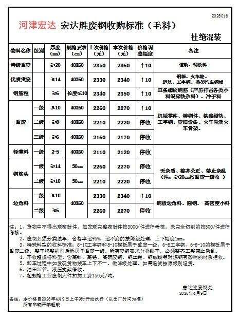 **日金烨钢铁废钢所有料型上调**元/吨。