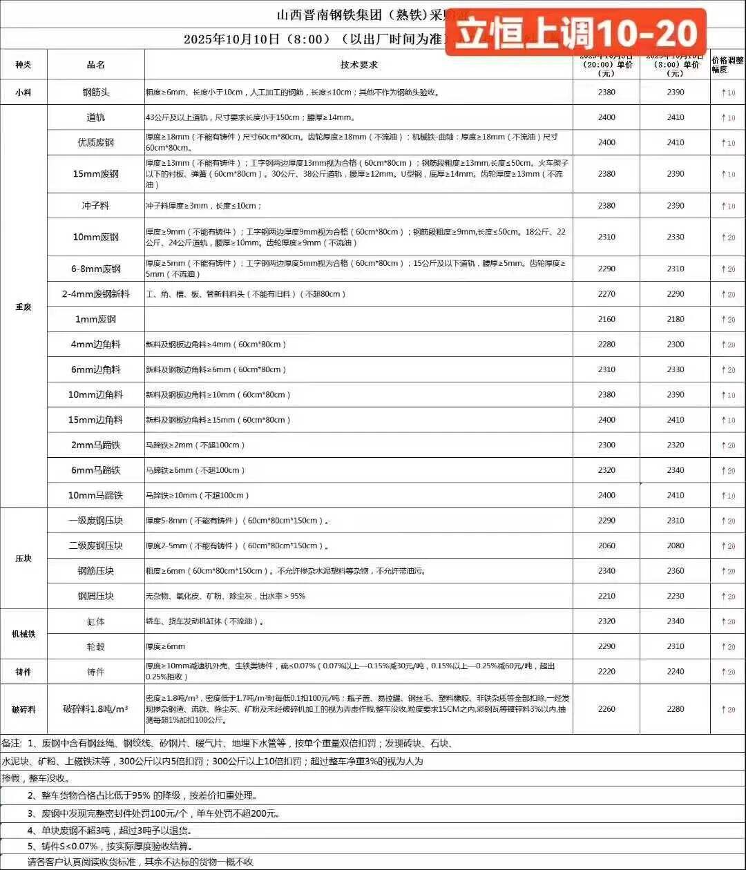 山西晋钢今日**点后废钢收购价格所有料型上调**元/吨。重废二****,中废一****,中废二****,*-*厚轻废****,清一色**-**厚特级****,清一色*-**厚特级****,清一色*-*厚特级****(停收),清一色模板****,清一色钢筋颗粒****,*-*厚钢筋压块****,*-**厚钢筋压块****,钢板压块****模板压块****,不含税。