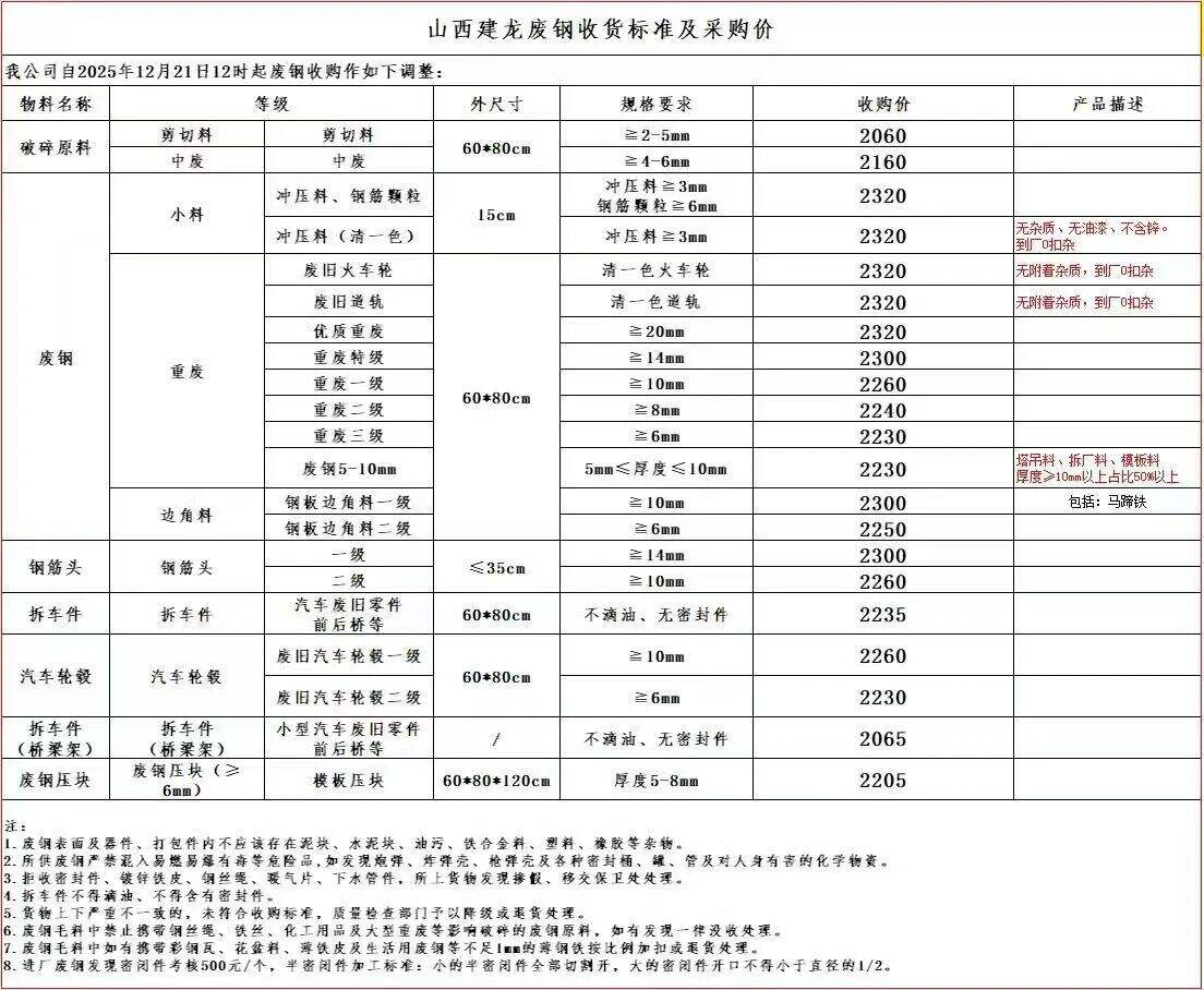 吕梁建龙预计**月**日**时**分,小料下调*元,其余所收料型下调**元/吨,以后续价格表为准。