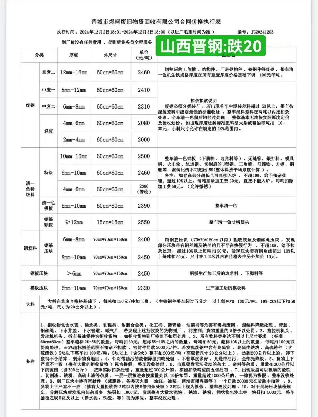 晋城福盛,今日*点**后废钢收购价格钢筋颗粒上调**元/吨,其他料型不变,具体看价格表*日晋城福盛最新如下,废钢,重废**-**厚****,*-**厚****,*-*厚****,*-*厚重废****,清一色,特级**-**厚****,*-**厚****,钢筋颗粒****,钢筋压块****-****,钢板压块****,模板压块****,不含税