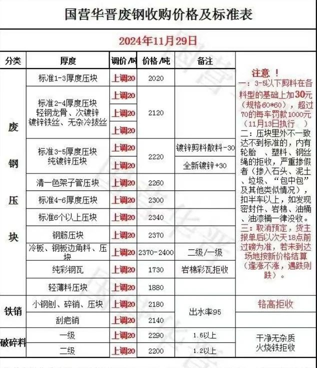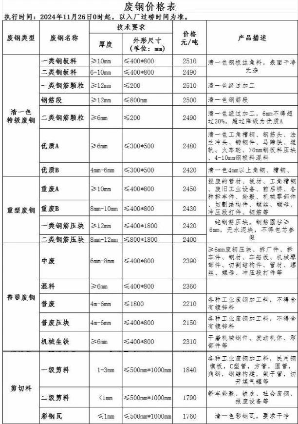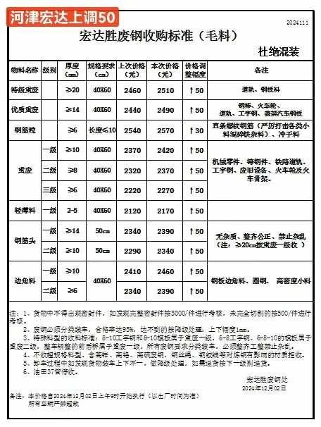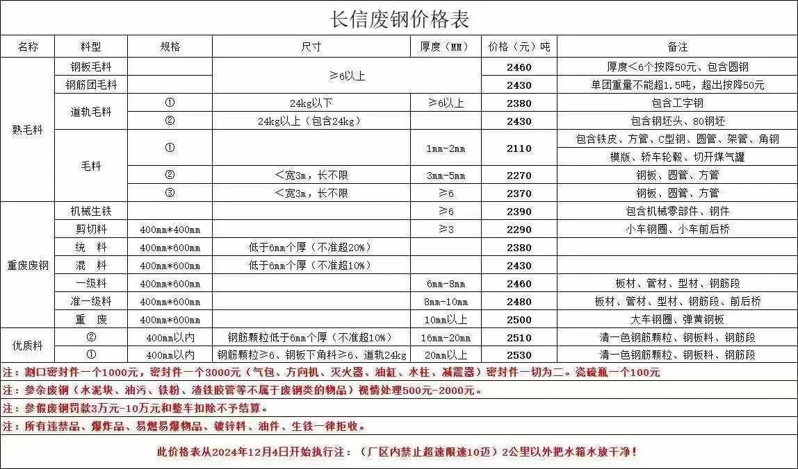 通知:从****年**月*号*时废钢统一上调**元/吨,废钢车辆下午五点半之前进厂,两公里外必须把水箱水放干净,长信能源处,*日长信废钢,钢板毛料****,钢筋团毛料****,道轨毛料****-****,毛料****-****,机械生铁****,剪切料****,统料****,混料****,一级料****,准一级料****,重废****,优质料****-****,不含税