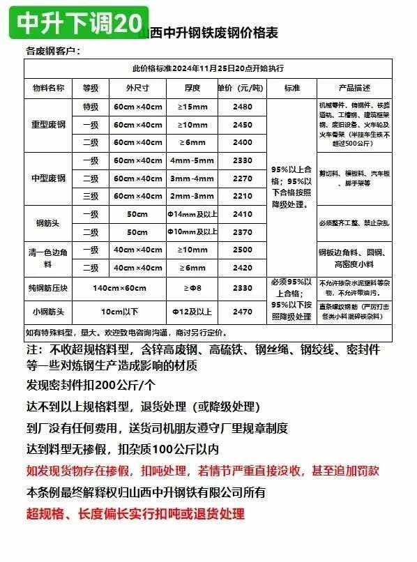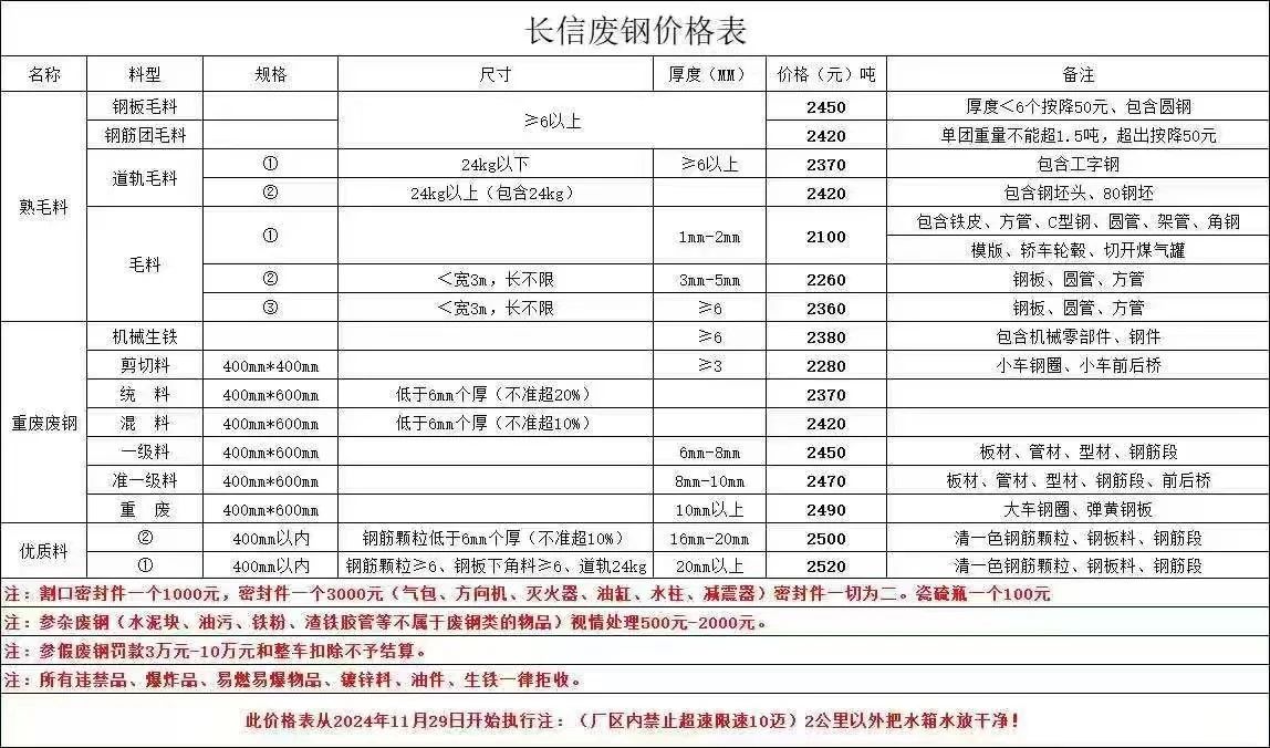 通知:从****年**月**号*时废钢统一下调**元/吨,废钢车辆下午五点半之前进厂,两公里外必须把水箱水放干净,长信能源处,**日长信废钢,钢板毛料****,钢筋团毛料****,道轨毛料****-****,毛料****-****,机械生铁****,剪切料****,统料****,混料****,一级料****,准一级料****,重废****,优质料****-****,不含税