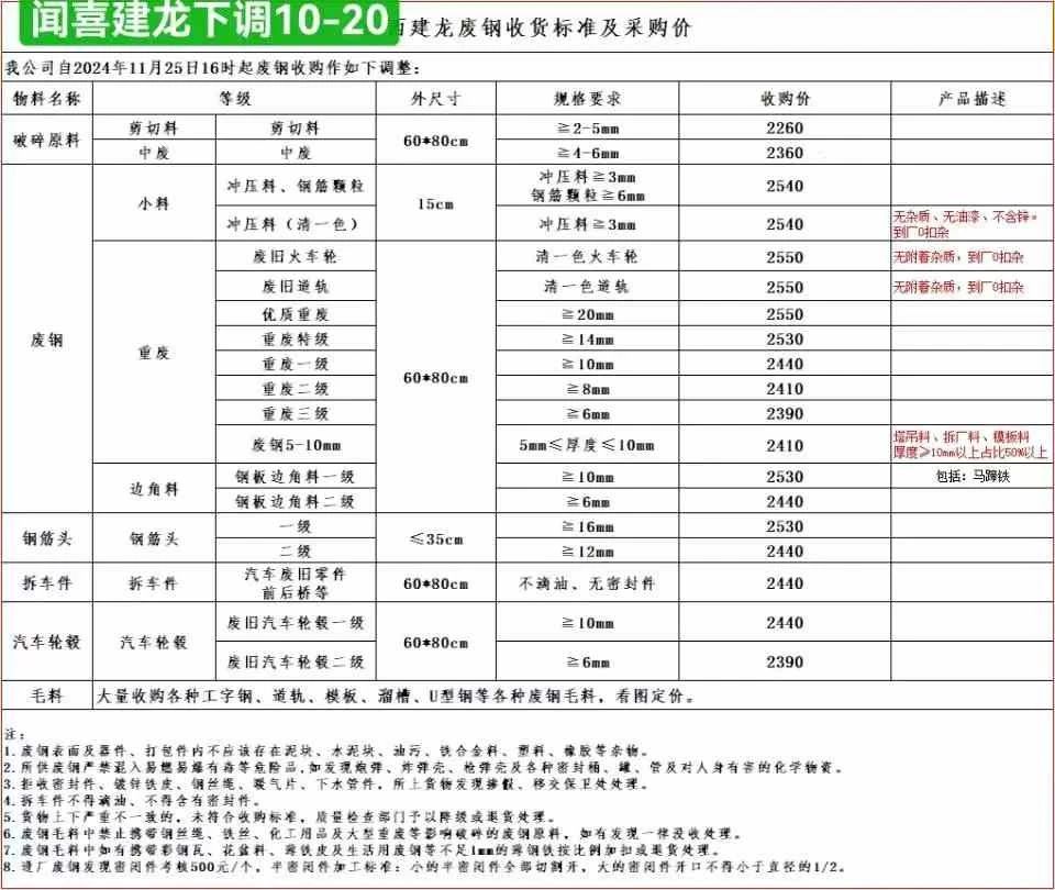 山西建龙,**月**日废钢料型统一下调**~**元/吨,**日山西建龙废钢最新跌**-**,剪切料****,中废****,小料****,废旧火车轮****,优质重废****,重废特级****重废一级****重废二级****重废三级****,钢板边角料一级****钢板边角料二级****钢筋头一级****钢筋头二级****不含税