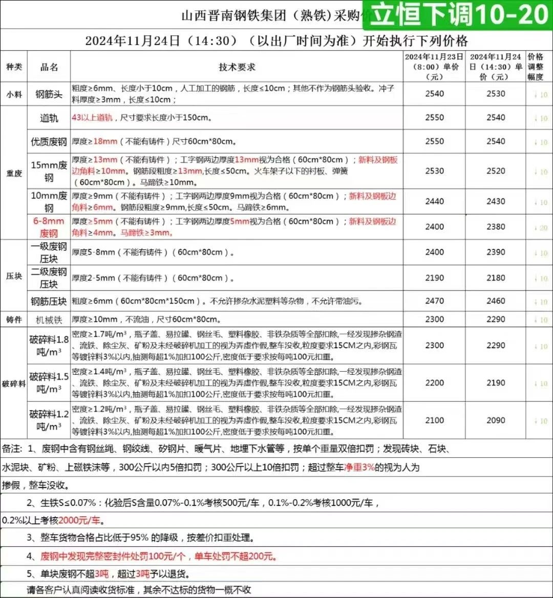 立恒通知,**月**日**点**分,废钢价格下调**元,*-*废钢下调**元,具体以价格表内为准,以出厂时间为准!,**日立恒跌**~**,钢筋头****,道轨****,优质废钢****,**厚废钢****,**厚废钢****,*-*厚****,一级废钢压块****,二级废钢压块****,钢筋压块****,铸件****,*.*比重破碎料****,不含税立恒通知,压块料型目前暂定停止收购,具体恢复收购时间另行通知