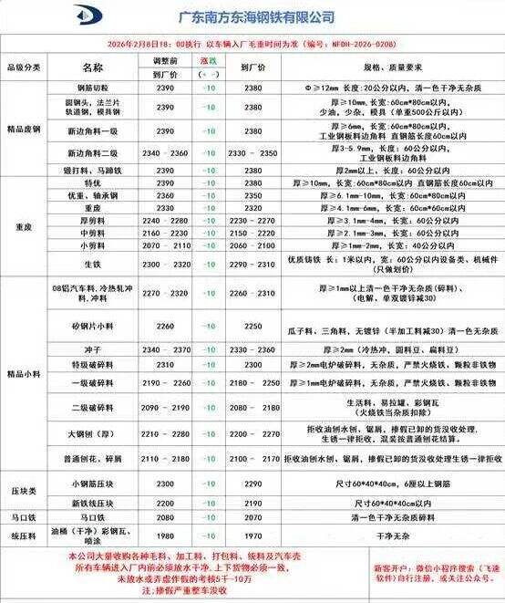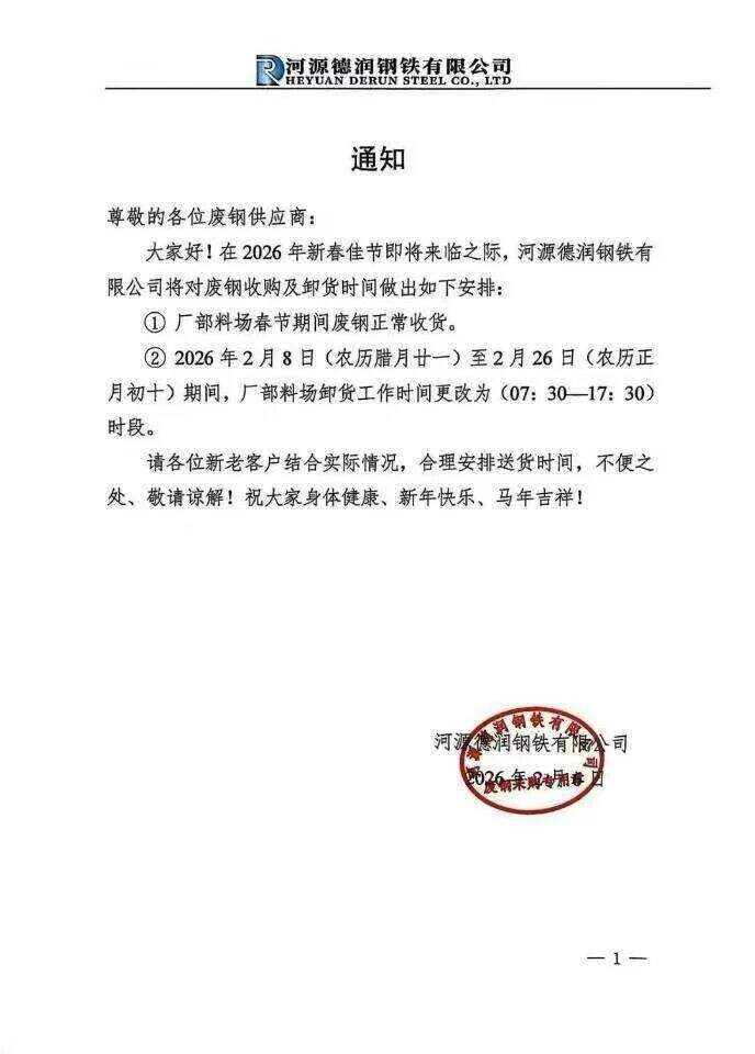 河源粤东通知:自****年*月**日(农历十二月廿五)下午**:**起,停止收购废钢。二、恢复收购时间自****年*月**日(农历正月初八)上午*:**起,恢复正常废钢收购业务。