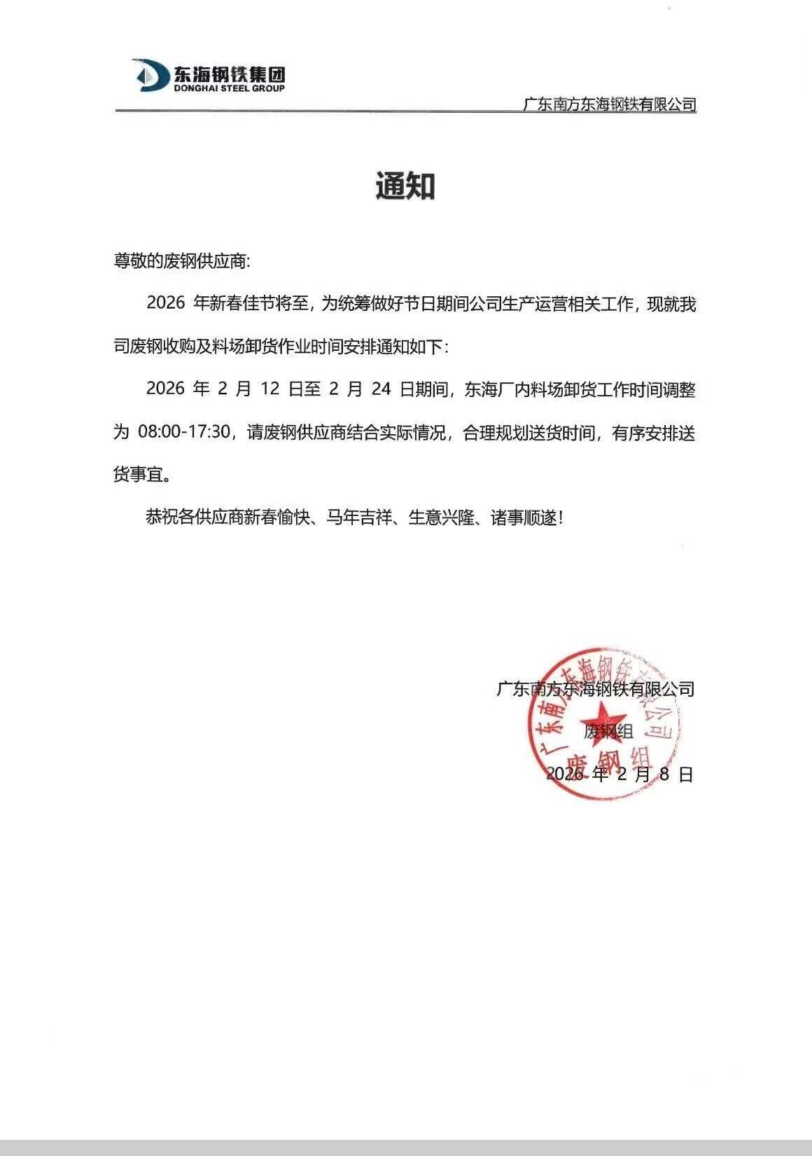 南方东海钢铁通知尊敬的废钢供应商:****年新春佳节将至,为统筹做好节日期间公司生产运营相关工作,现就我司废钢收购及料场卸货作业时间安排通知如下:****年*月**日至*月**日期间,东海厂内料场卸货工作时间调整为**:**-**:**,请废钢供应商结合实际情况,合理规划送货时间,有序安排送货事宜。恭祝各供应商新春愉快、马年吉祥、生意兴隆、诸事顺遂!
