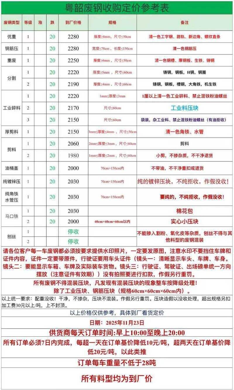 **日粤东废钢跌**。