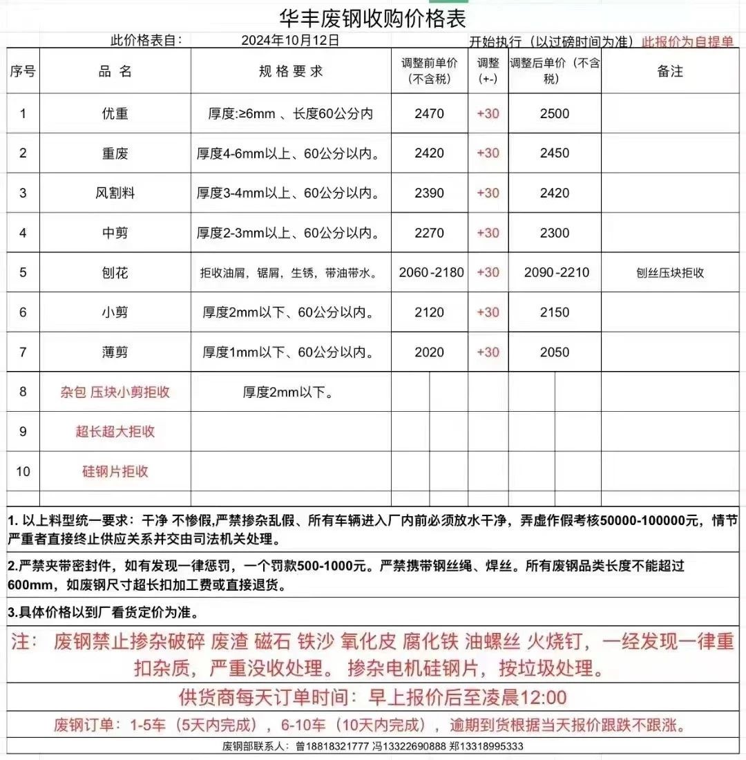 **日忠信华丰钢铁废钢涨**:优重****,重废****,风割料****,中剪****,刨花****-****,小剪****,薄剪****。自提,不含税,注禁止携带密封等危险品