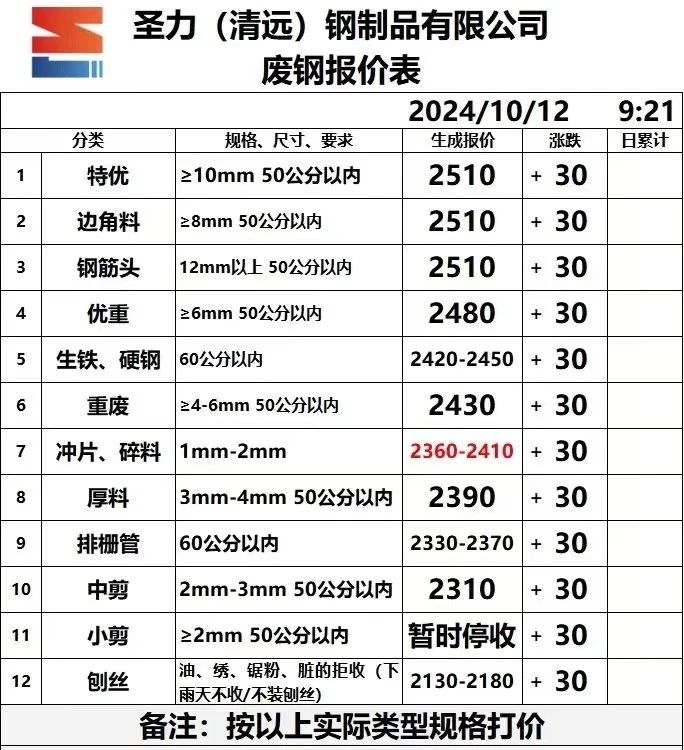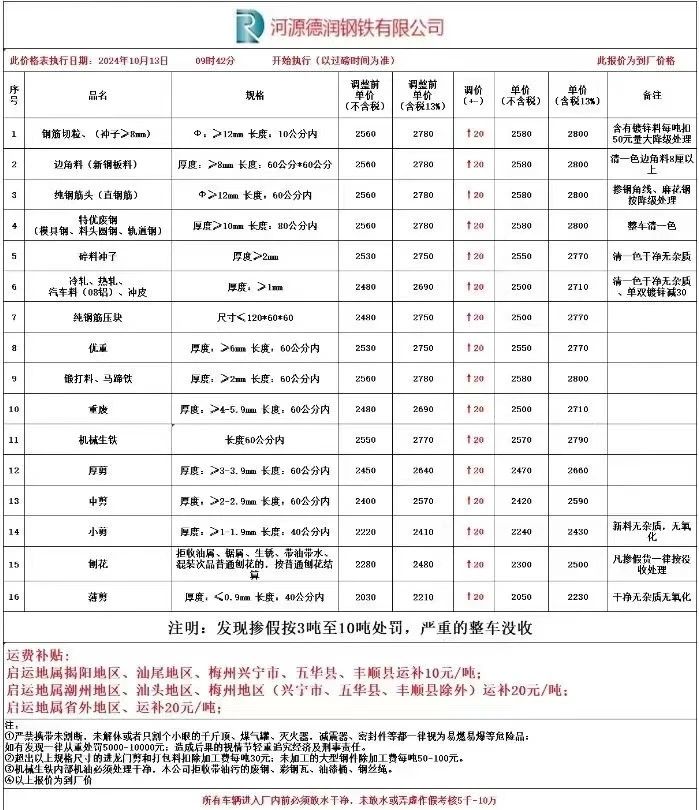 **日河源德润涨**:钢筋切粒****,边角料(新钢板料)****,纯钢筋头****,模具钢、料头圆钢****,硅钢片停收,冷轧、热轧(碎料冲子)****,纯钢筋压块****,优重****,锻打料、马蹄铁****,重废****,机械生铁、生熟混装****,厚剪****,中剪****,小剪****,刨花****不含税