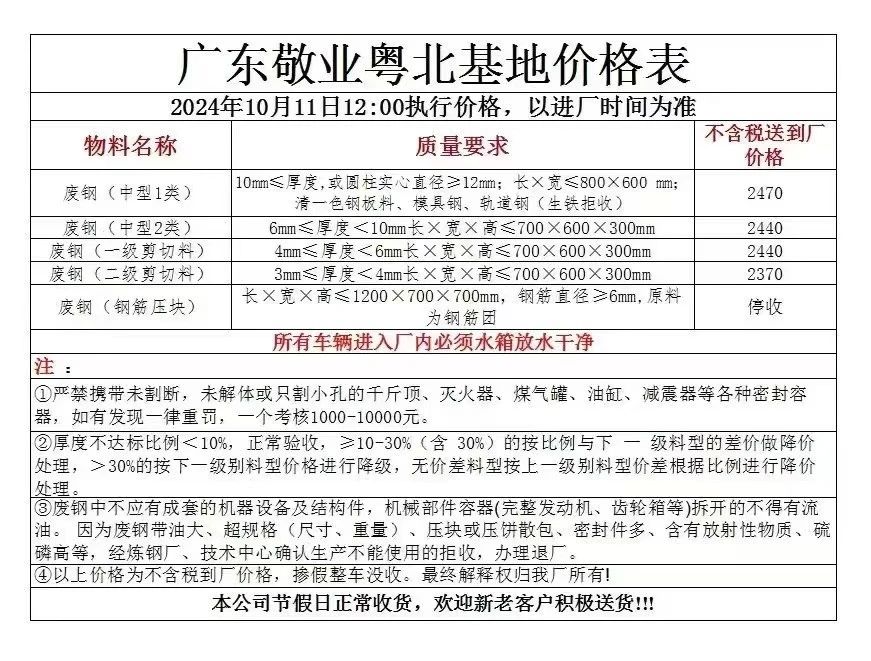 广东敬业粤北基地**点跌**,以进厂过磅时间为准。
