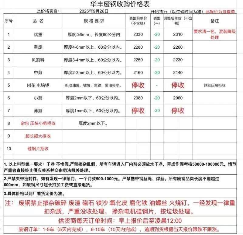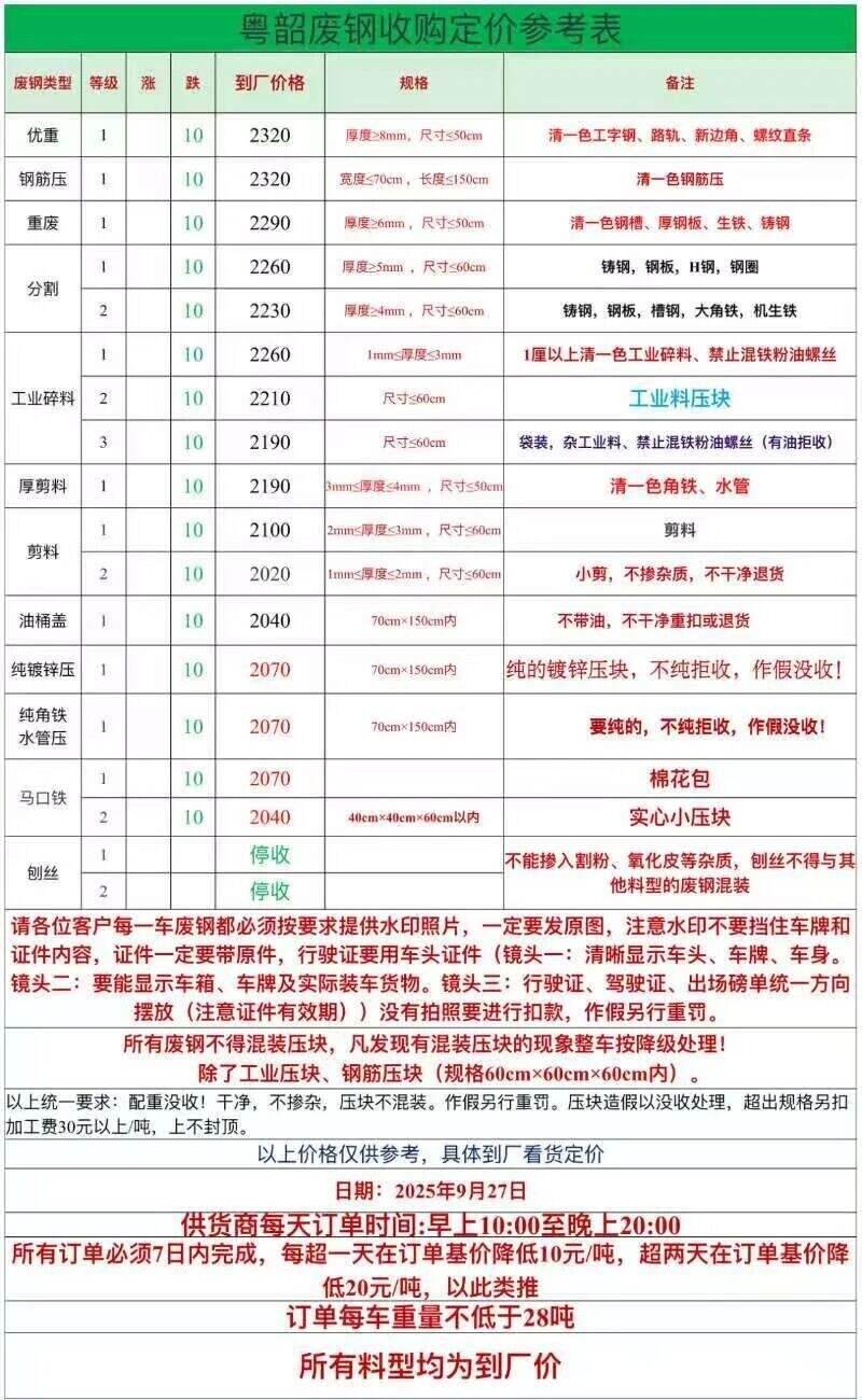 韶关粤韶通知:****年*月**日废钢全部料型即时下调**元/吨(收到此信息即时生效,优重****,钢筋压****,重废****,分割****-****,工业碎料****-****,厚剪料****,剪料****-****,油桶盖****,马口铁****-****,刨丝停收