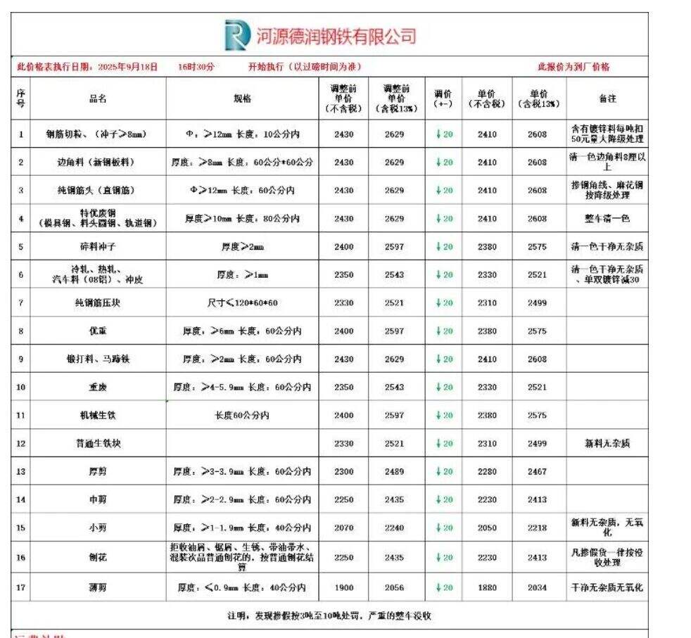 河源粤东全部报跌**元每吨(****年*月**日分**.**开始执行)**日河源粤东最新价跌**:特优****优重****重废****厚剪****中剪****小剪****薄剪****工业冲子料****工业冲片****机械生铁****刨花****一级破碎料****二级破碎料****轮胎丝废书钉****铁丝头****