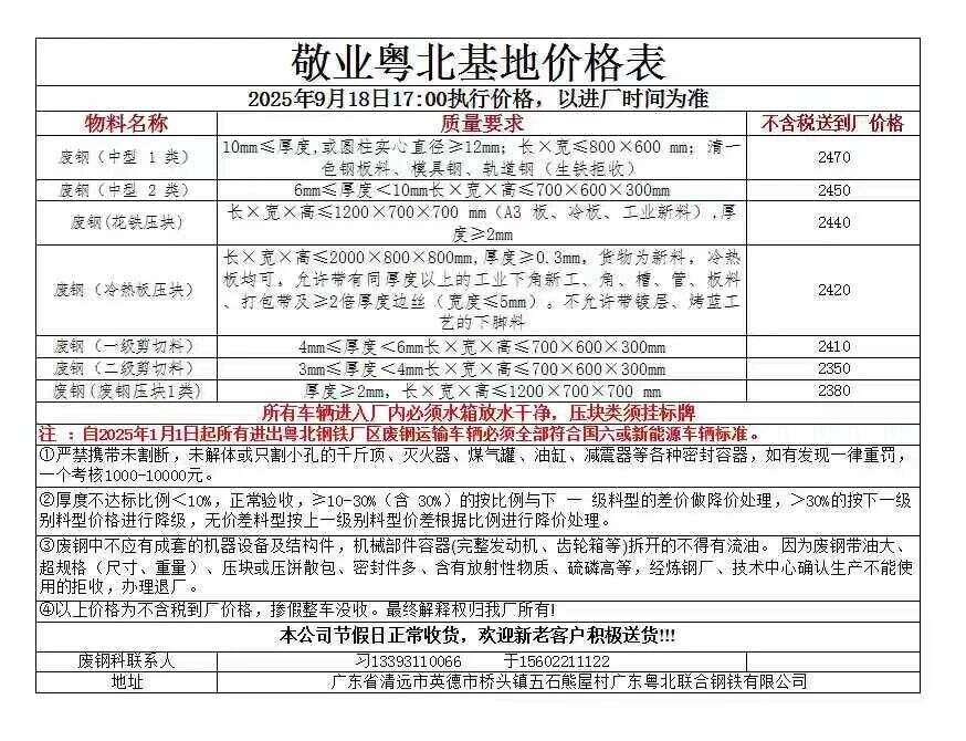 韶关粤韶通知:****年*月**日废钢全部料型即时下调**元/吨(收到此信息即时生效详细价格见报价表):